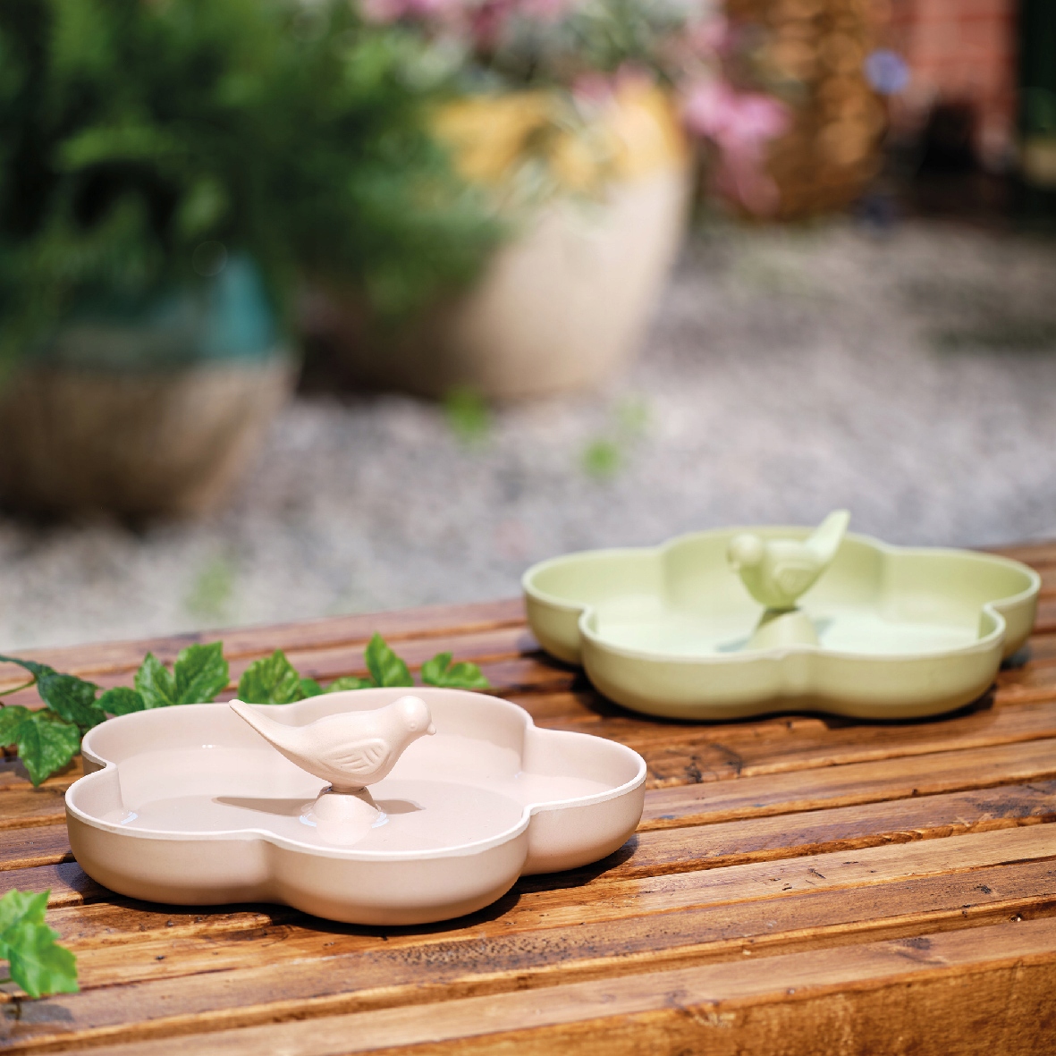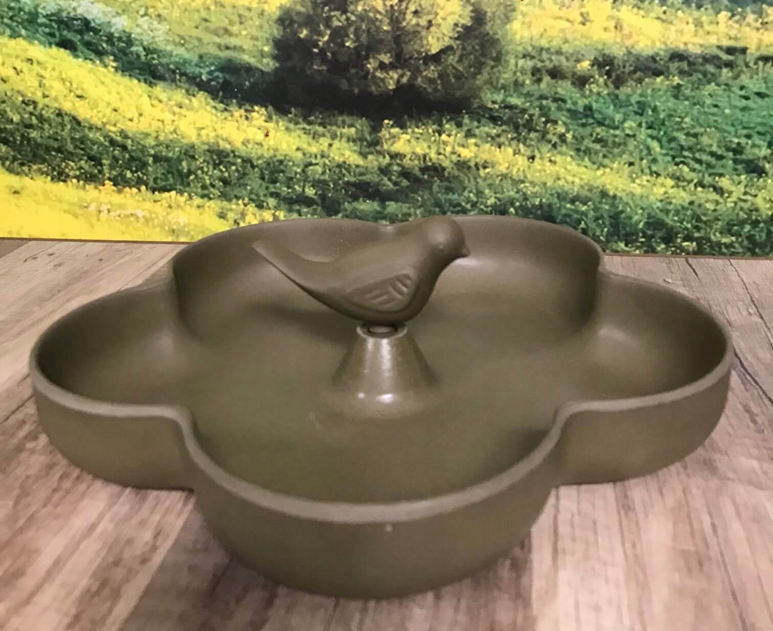 Бамбук, міцна годівниця для птахів для саду. У формі квітки з пташкою, що сидить посередині. Фонтанчик для пиття, а також ідеальний горщик для посадки сукулентів. Ідеальний декоративний гаджет для розміщення в саду, на підвіконні, терасі або балконі.