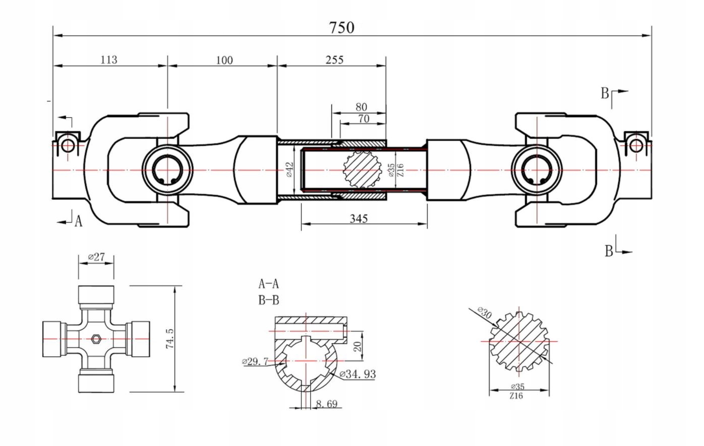 Телескопічний карданний вал 750-1000 мм 520 Нм, технічна інформація: