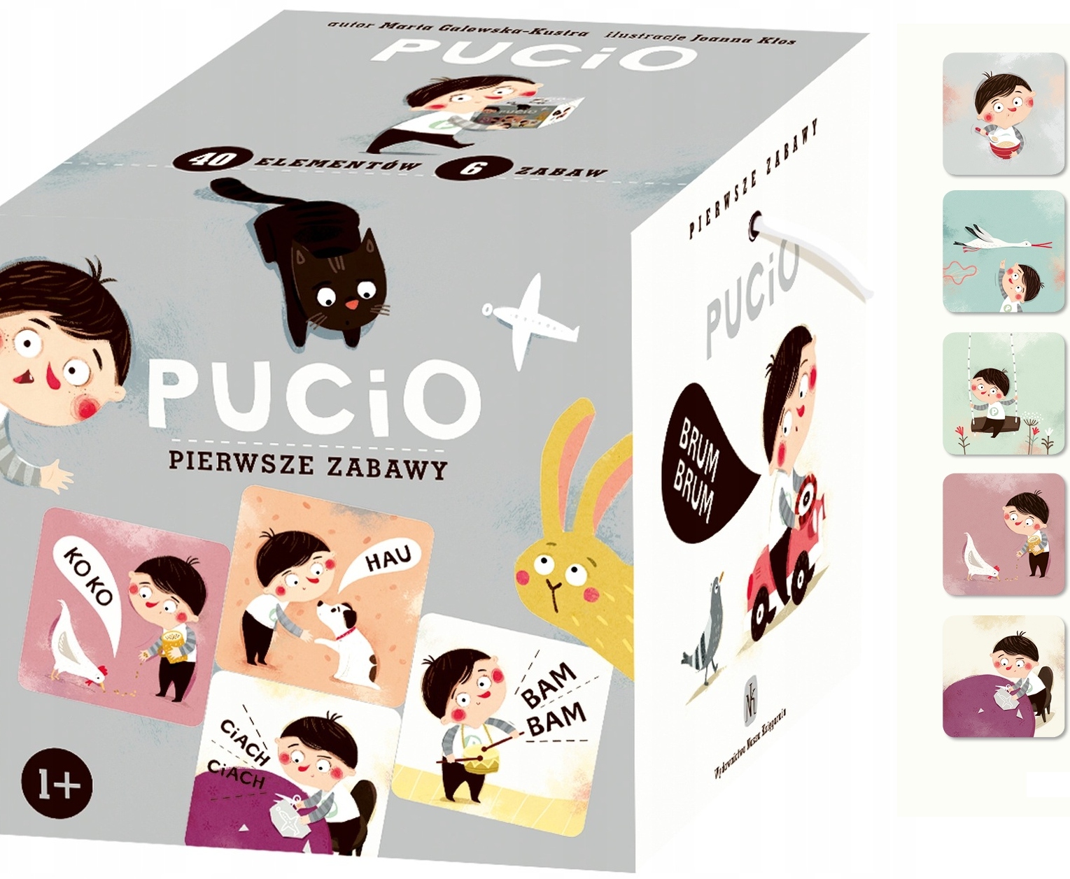 Розвиваюча гра «Пучо. “Getting Fun” виходить за рамки вже відомої глядачеві формули. Цього разу Пучіо та тварини, за якими він спостерігає, з’являються не на сторінках книги, а на окремих картках із зображеннями. Набір містить два типи карток: одна містить зображення Пучіо разом із предметом або твариною, яка видає звуки, і певний звукоподражальний вираз, що відповідає цьому зображенню (наприклад, ko ko, ciach, am am або kle kle). Всього їх 20 карток - це лише записи звуків, без картинок - ті ж, що з'явилися раніше. Їх також 20, крім карток у грі «Пучіо». "Перші ігри" також містять інструкції для батьків або опікунів - це пропозиція з 6 розвиваючих ігор, які підходять для дітей від року.