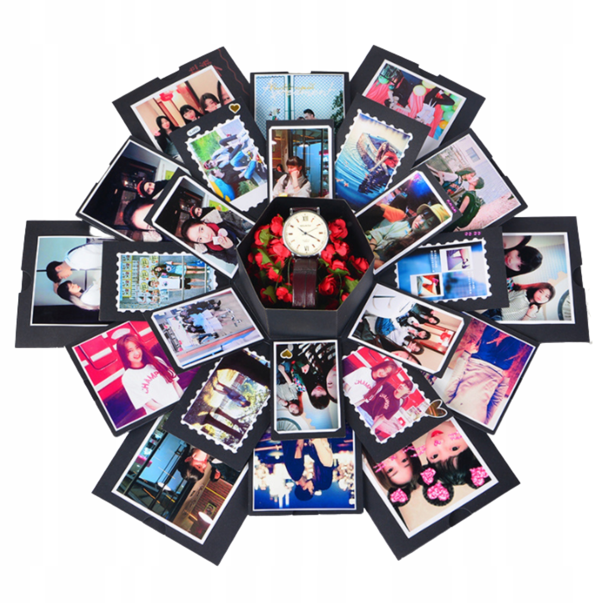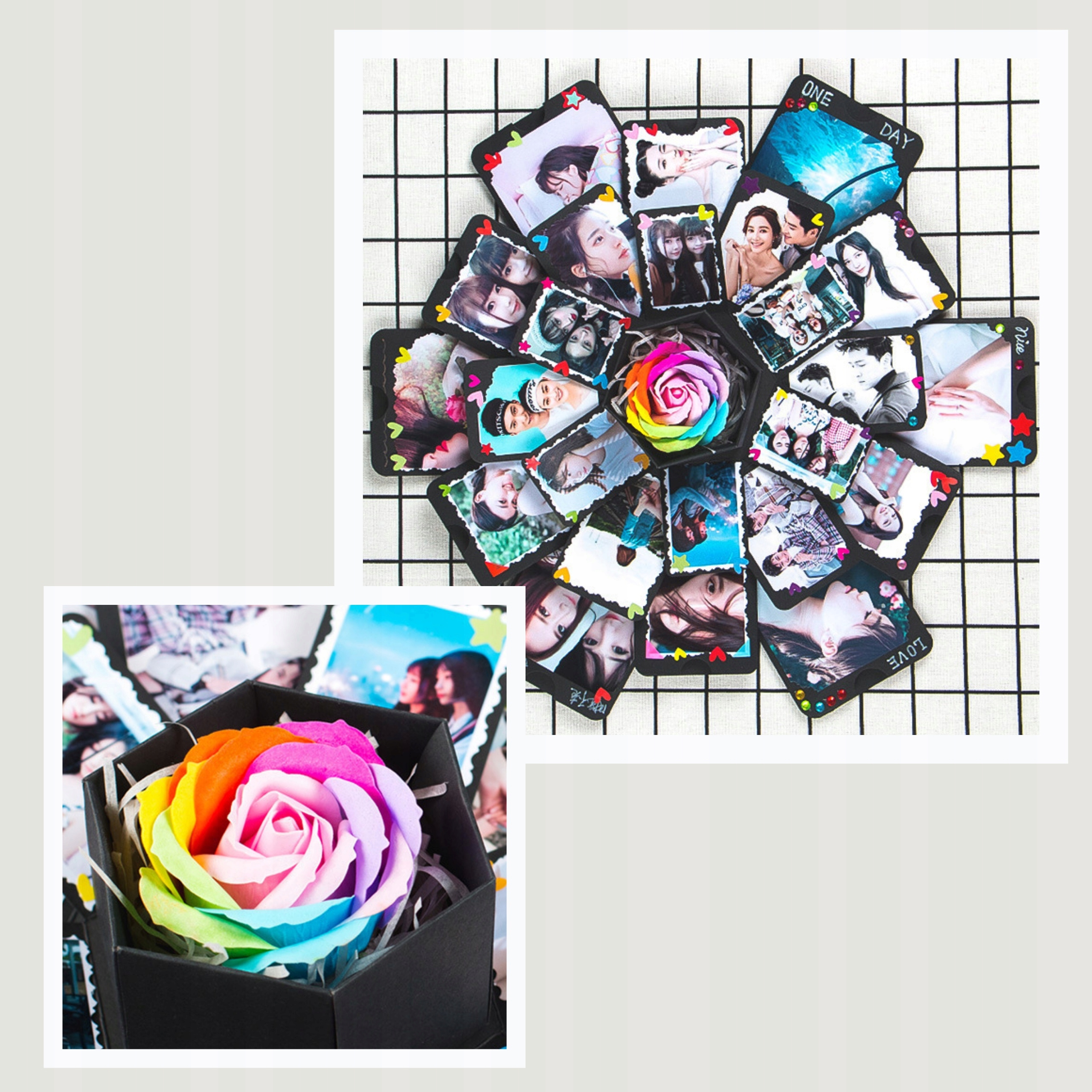 У коробці, що вибухає, багато сюрпризів. Коли його відкривають, його багатошаровий дизайн вибухає, а боки опускаються, показуючи фотоальбом у формі троянди та маленьку подарункову коробку всередині.