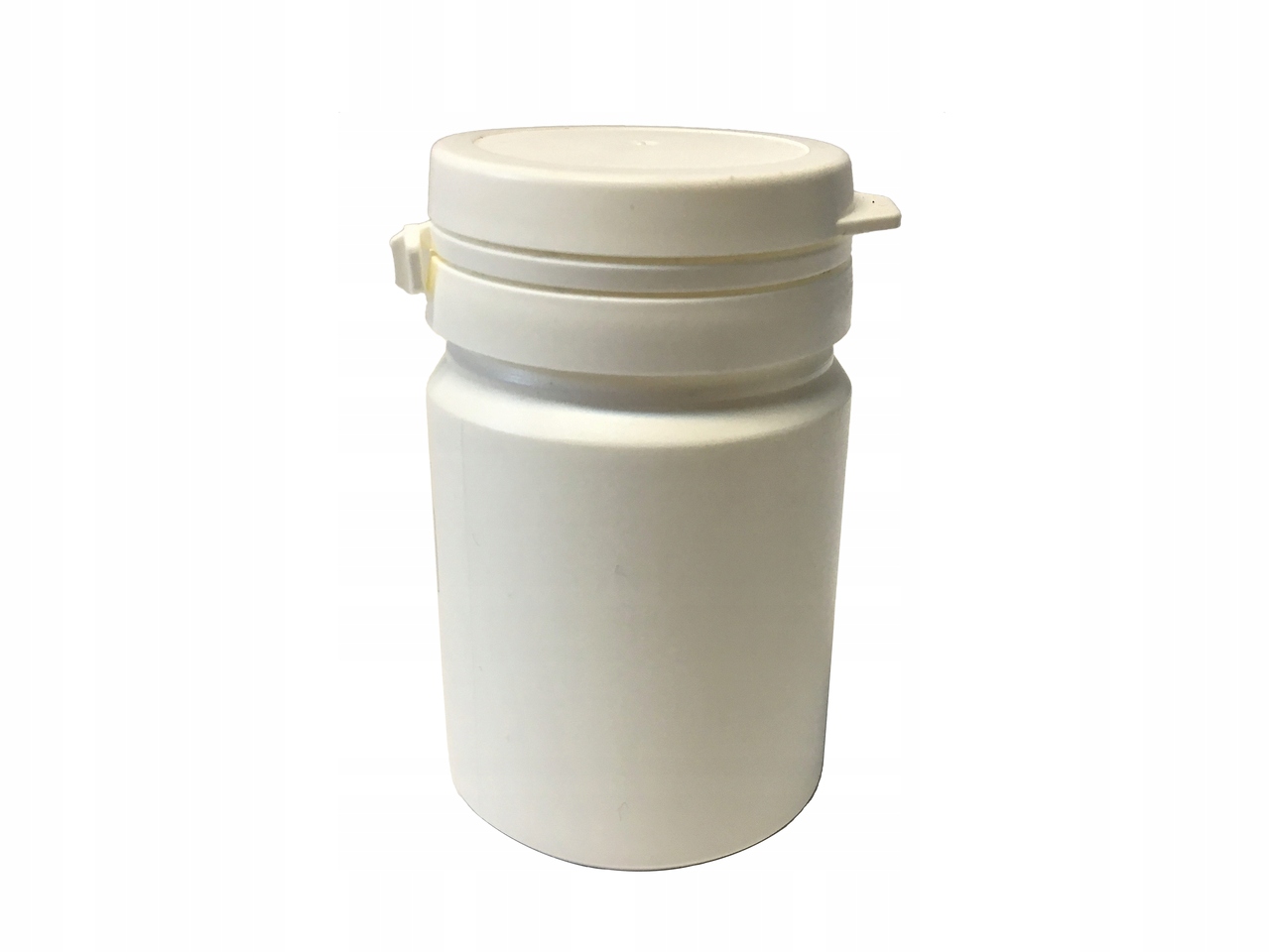 Коробка закрита кришкою на блискавці, Ø 43, ємність 75 мл, біла, призначена для упаковки фармацевтичної продукції, порошків, капсул, лікарських засобів. Продукт має сертифікат якості, виданий Інститутом медицини у Варшаві.