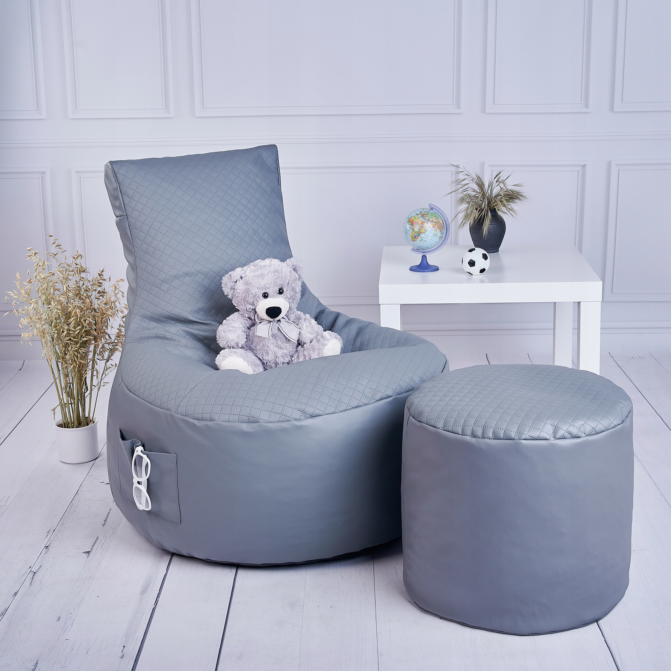 - Міцний стьобаний матеріал у верхній частині пуфа та підніжжя