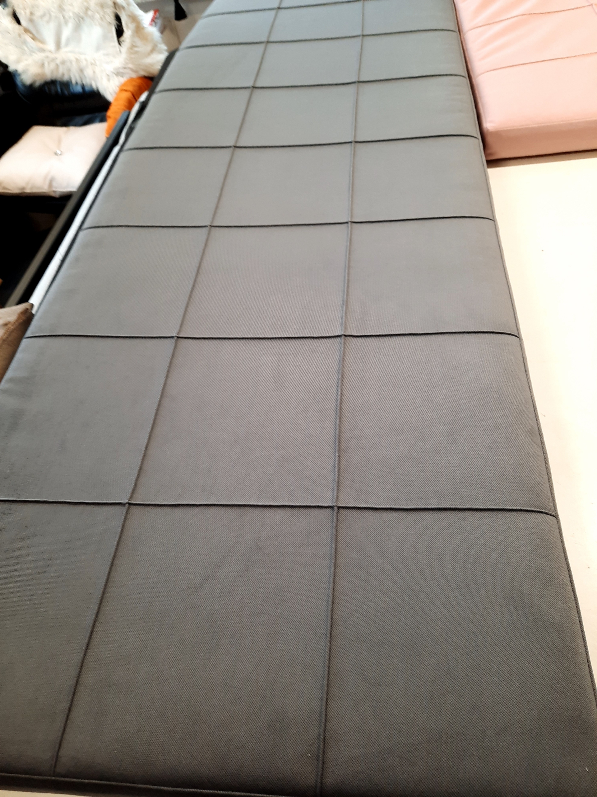 Поруч з ним є великий підголівник, приблизно 80x200, з вертикальними швами кожні 13 см. Ззаду панель підголівника обшита кріпленням до стіни на липучках (липучки можна придбати на наших аукціонах) Чохол знімається для прання, що особливо актуально в кімнатах дітей та алергіків
