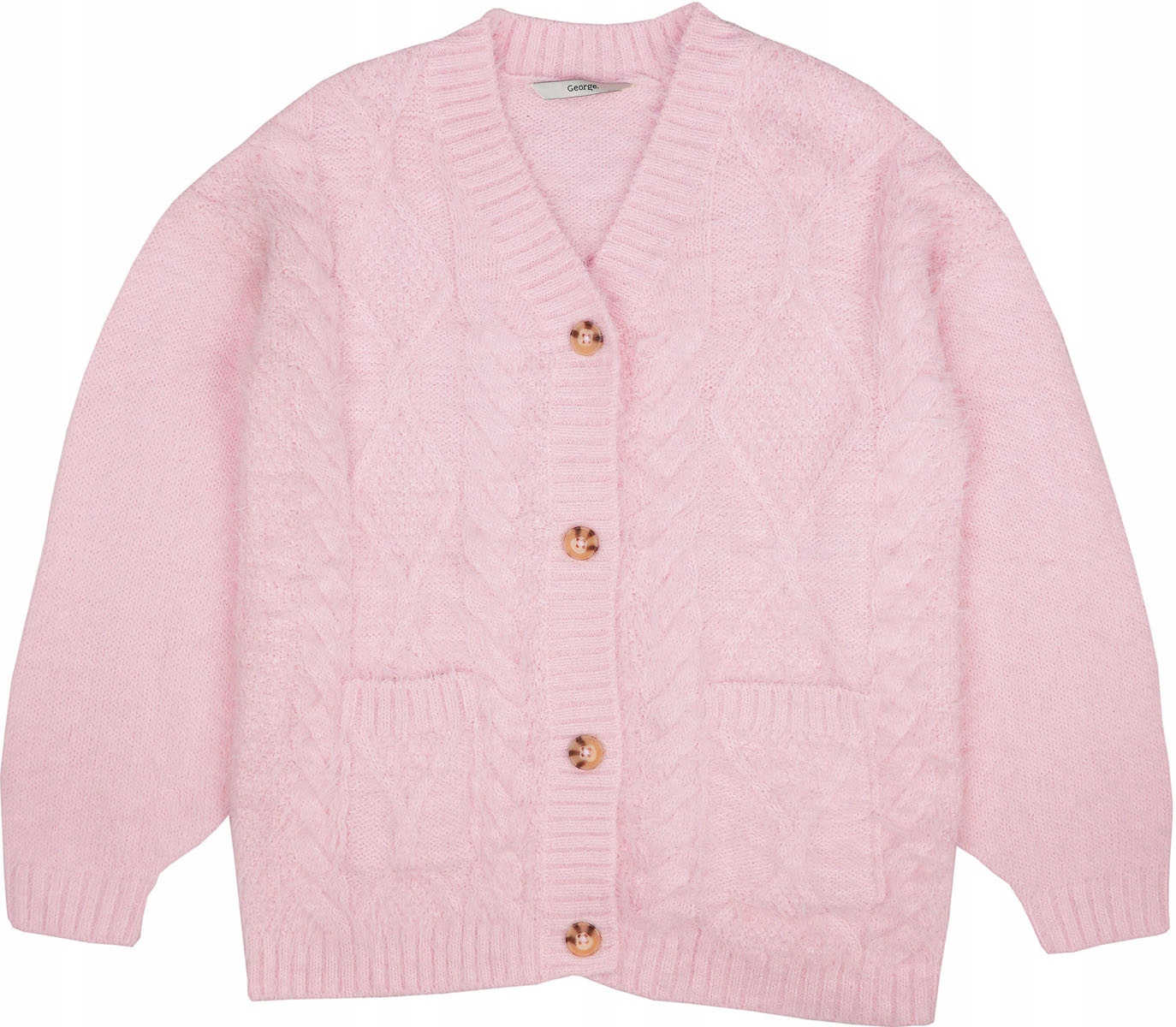 Новий кардиган від George у відтінку пудрово-рожевого. Виготовлений з ворсистого матеріалу. Застібається спереду на кнопки. V-подібний виріз. Светр з довгим рукавом. Він має витончену модну тканину спереду та дві кишені.