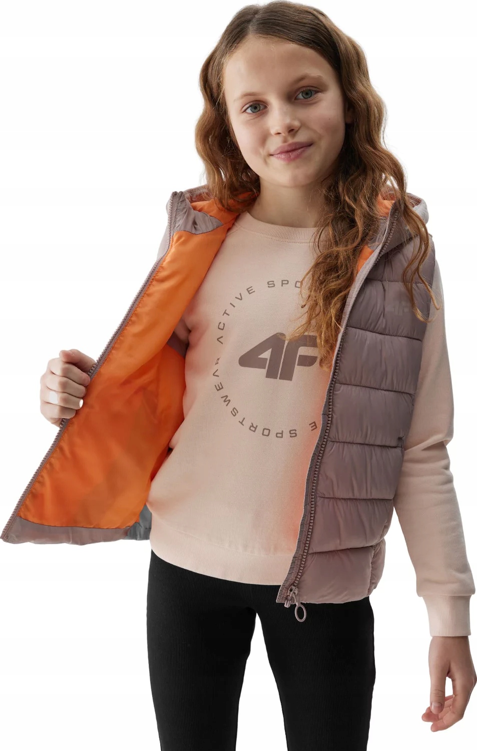 Пухова жилетка для дівчинки 4F – ідеальне рішення для холодних днів. Виготовлений з високоякісних матеріалів, що забезпечує відмінну теплоізоляцію. Завдяки технології 4F Warm і синтетичному наповнювача зігріває навіть у найхолодніші дні. Куртка без рукавів на блискавці і з високим коміром захищає від вітру і холоду. Бічні кишені можна використовувати для зберігання дрібниць, а логотип бренду додає стиль. Пухова жилетка 4F – невід’ємна частина гардеробу кожної дівчини.