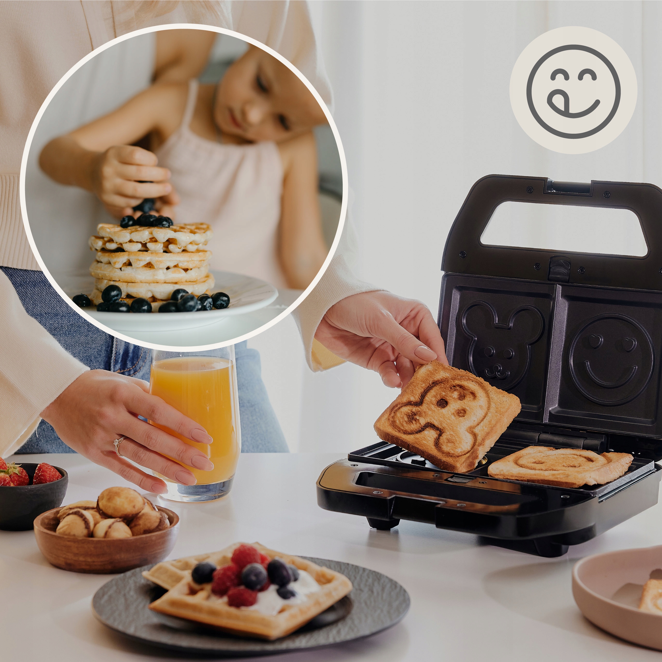 Щоденні страви можуть бути реальними. Спеціальні плитки для підігріву, що входять до набору, не лише дозволяють ідеальну підготовку хрусткого та гарячого хліба, але й випікання вражаючі візерунки на поверхні тостів . Підготуйтеся до закусок своїх дітей, які не тільки смакують, але й весело . Чарівні посмішки на бутербродах зроблять кожен укус, щоб викликати радість.