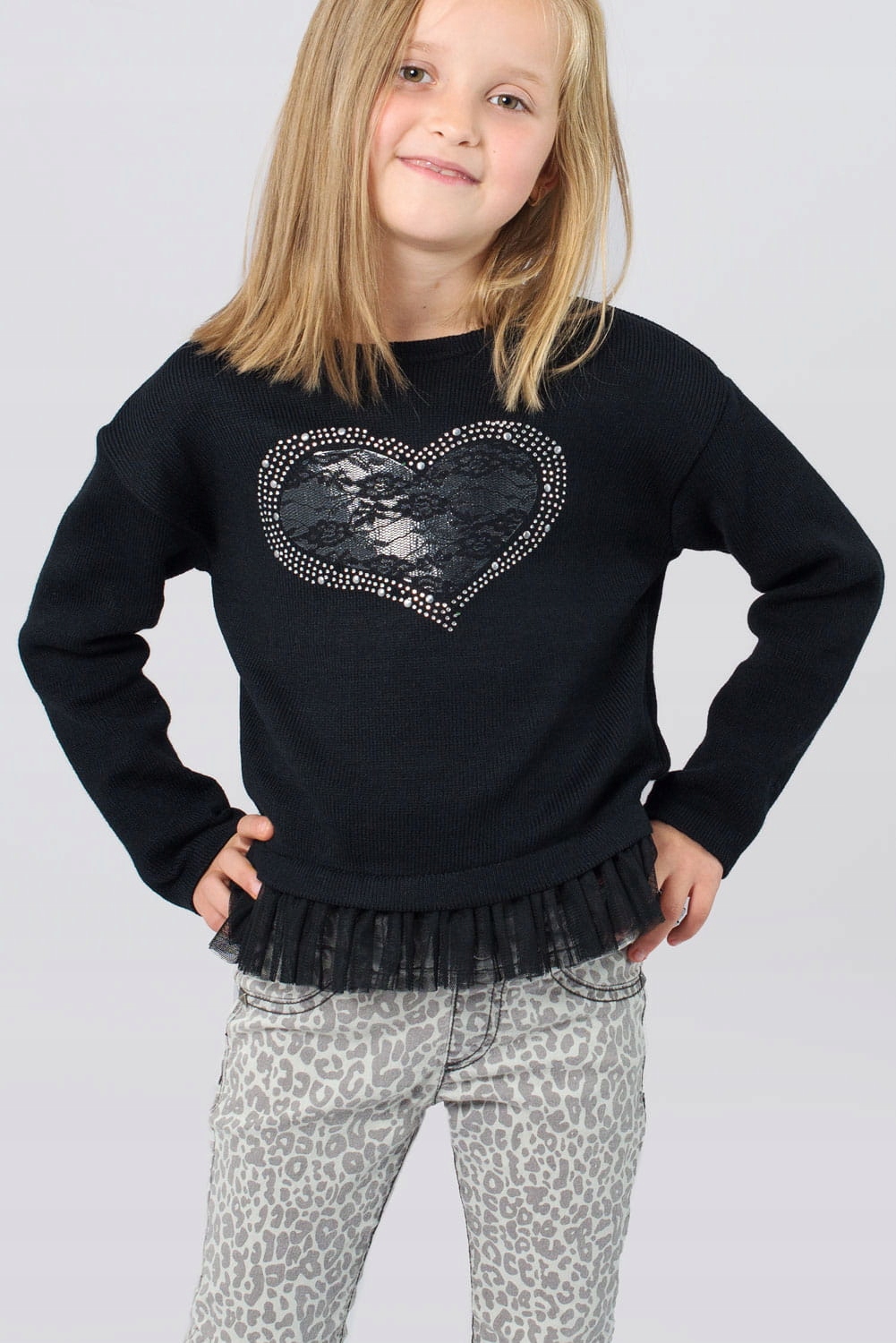 Класичний чорний светр для дівчинки. Модний крій. На передній частині светра розташоване мереживне серце, прикрашене мерехтливими каменями, а нижня частина светра оброблена тюлем. Ідеальна ідея для дівочої укладки. Ідеально підходить як для школи, так і для різдвяного вечора. Светр ідеально поєднується як зі спідницею, так і з брюками. Довгий рукав, одягається через голову. В наявності розміри: 92-158. Польський продукт.