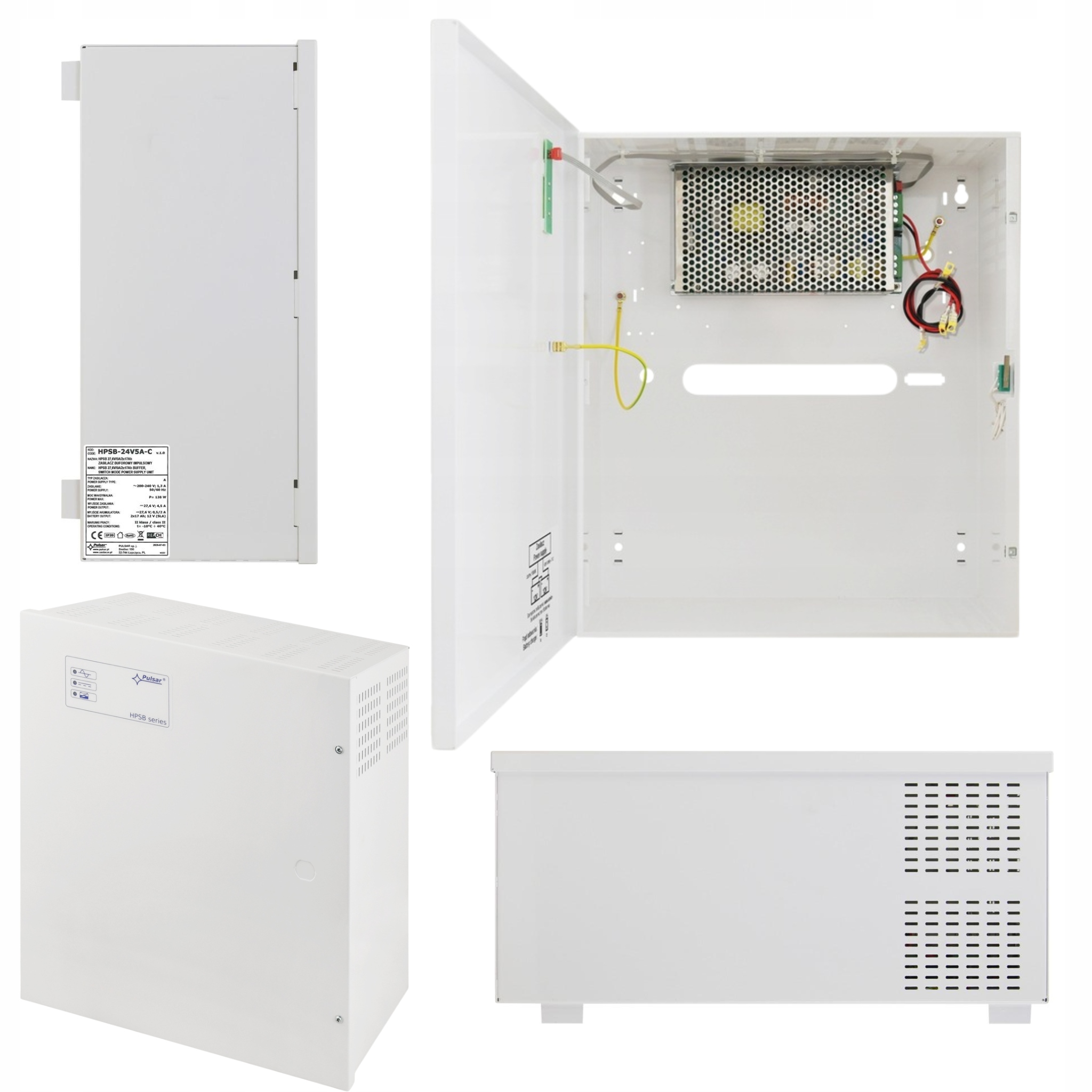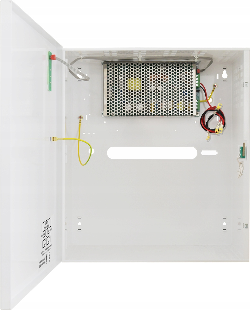 Блок живлення побудований на основі імпульсного блоку живлення з високою енергоефективністю та розміщений у металевому корпусі (колір RAL 9003) з місцем для двох батарей 12V 7Ah. Корпус оснащений мікроперемикачем, що сигналізує про відкриття дверей (передніх).