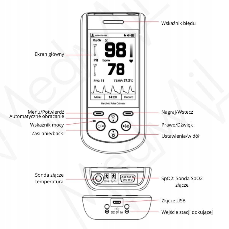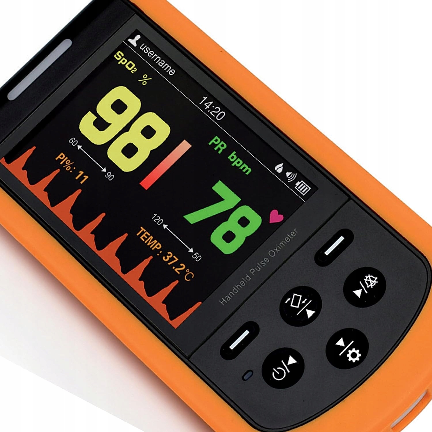 - великий 3,5-дюймовий TFT-дисплей із автоматичним обертанням для SpO2, PI, плетизмограми, PR і температури