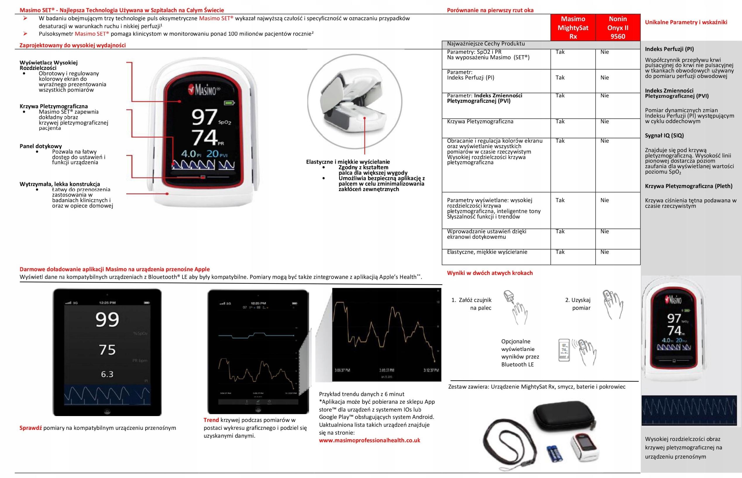 Masimo — американський виробник пульсоксиметрів і датчиків найвищої якості. Технологія вилучення сигналу (Masimo SET) дозволяє вимірювати сатурацію у рухомих пацієнтів і в умовах низької перфузії, що забезпечує точність вимірювання, недосяжну з іншими рішеннями. Революційний метод Masimo Rainbow SET, який використовує понад 7 довжин хвиль світла, відкрив нові можливості для неінвазивного безперервного вимірювання таких параметрів, як гемоглобін чадного газу, метгемоглобін або загальний гемоглобін.