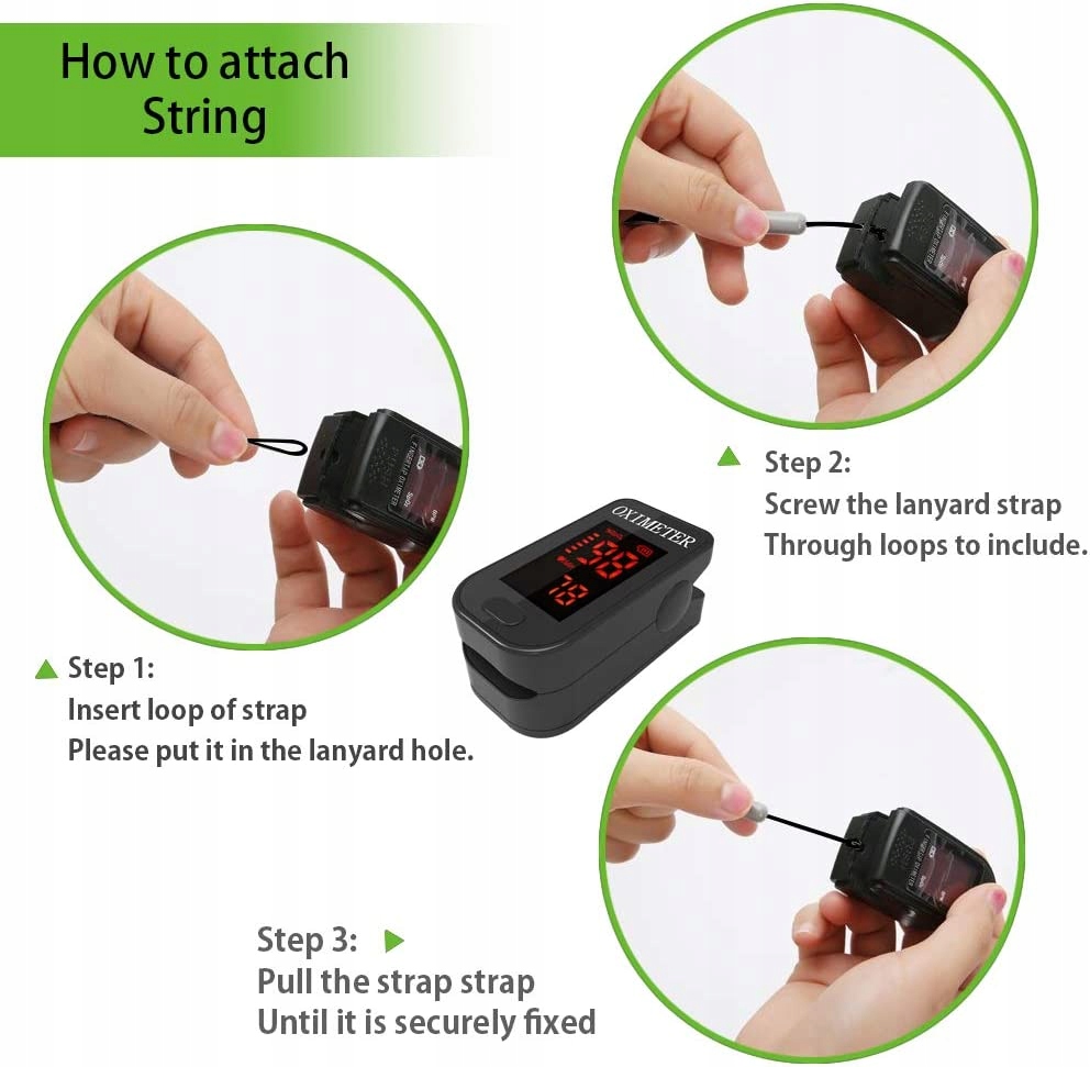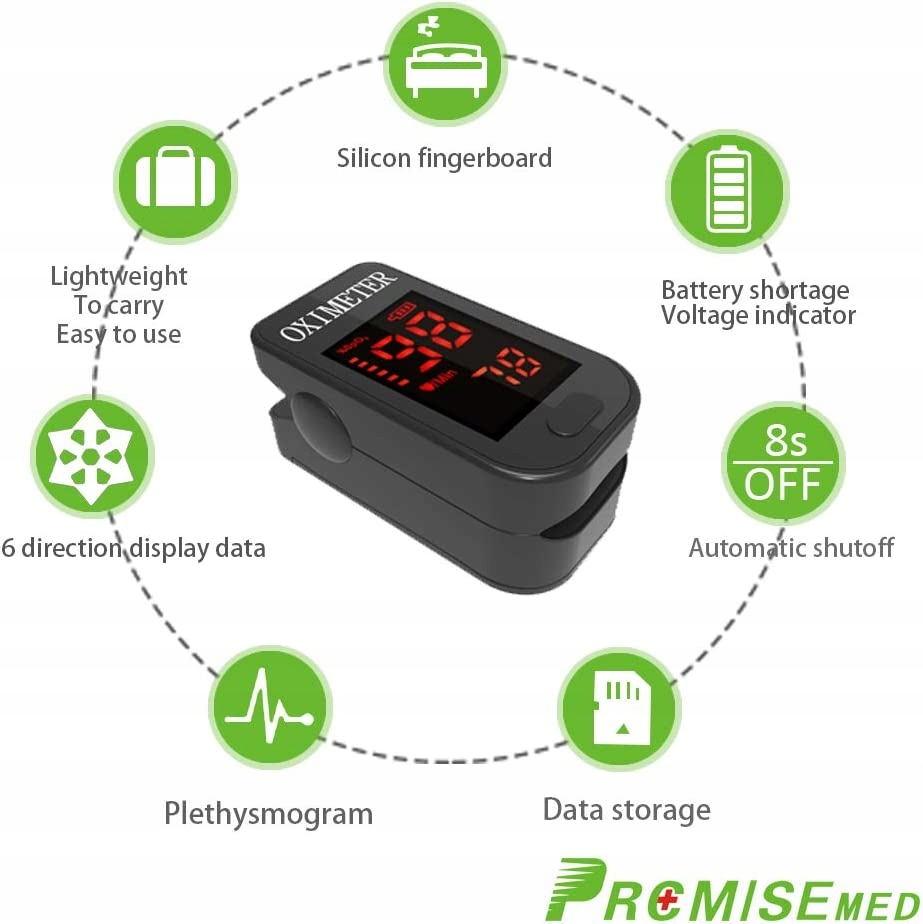 - Цифровий пульсоксиметр може виконувати всі операції за допомогою однієї кнопки. Операція проста та зручна, дозволяє точно визначити SpO2 (рівень насичення крові киснем), частоту та інтенсивність пульсу протягом 10 секунд.