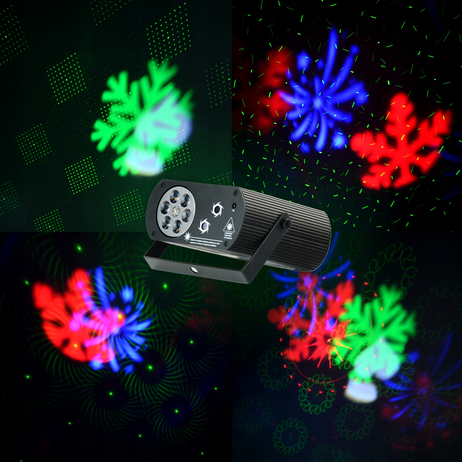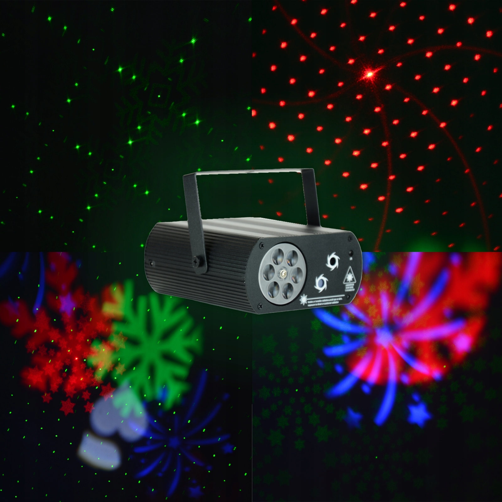 За допомогою якого ми можемо створювати цікаві світлові шоу. Апарат оснащений 3 лазерами - червоним, зеленим і синім і 16 ефектами GOBO. Сніговий лазер відображає рухомі точки та візерунки.
