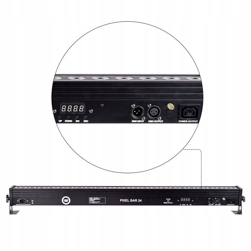 LIGHT4ME PIXEL BAR 24x3 MKIII IR — це світлова стрічка, якою можна керувати за допомогою бездротового інфрачервоного пульта дистанційного керування, укладеного в міцний металевий корпус. Джерело світла складається з 24 потужних світлодіодів потужністю 3 Вт, які працюють у колірній палітрі RGB (червоний, зелений, синій), а використана оптика дозволяє випромінювати один пучок світла під кутом 25°.