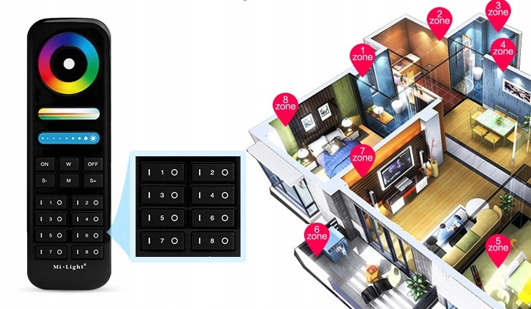Контролер Mi-Light дозволяє просто створювати зони освітлення. Контролер працює в 4-х і 8-зонному стандарті, також окремі контролери можна групувати разом. У певній зоні може бути будь-яка кількість контролерів (або лампочок, сумісних із системою Mi-Light). У нашій пропозиції є також дешевші набори Mi-Light - без зонних функцій. Ми не використовуємо підсилювачі сигналу в системі Mi-light. Просто використовуйте більше контролерів і призначте їх одній зоні.