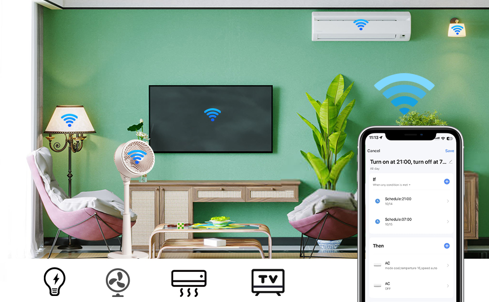 - 【Установити розклад】Установити таймери для ввімкнення та вимкнення пристроїв у певний час або створювати власні сценарії для кількох пристроїв. Перетворіть свою основну побутову техніку на розумні пристрої, щоб зробити своє життя розумнішим і зручнішим.