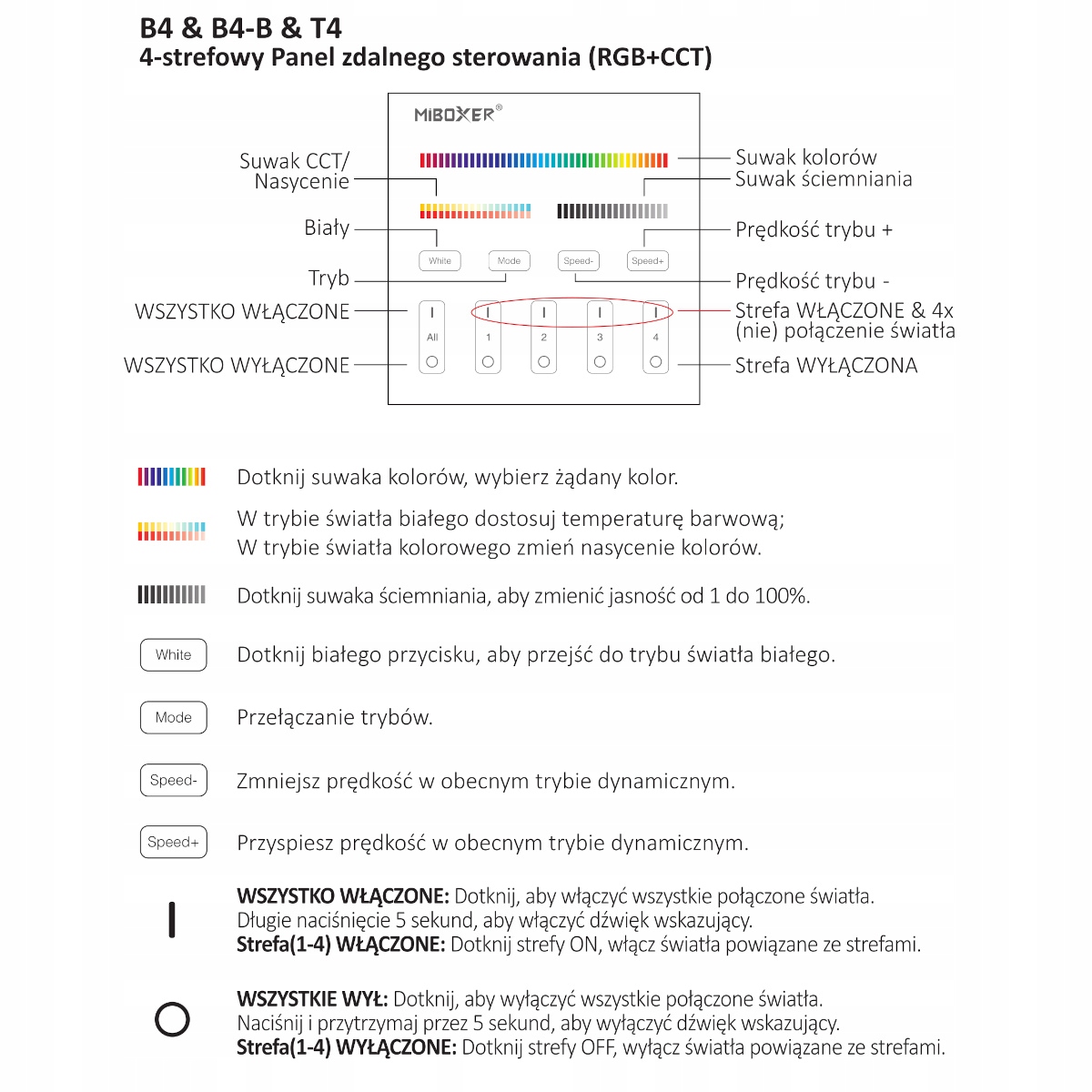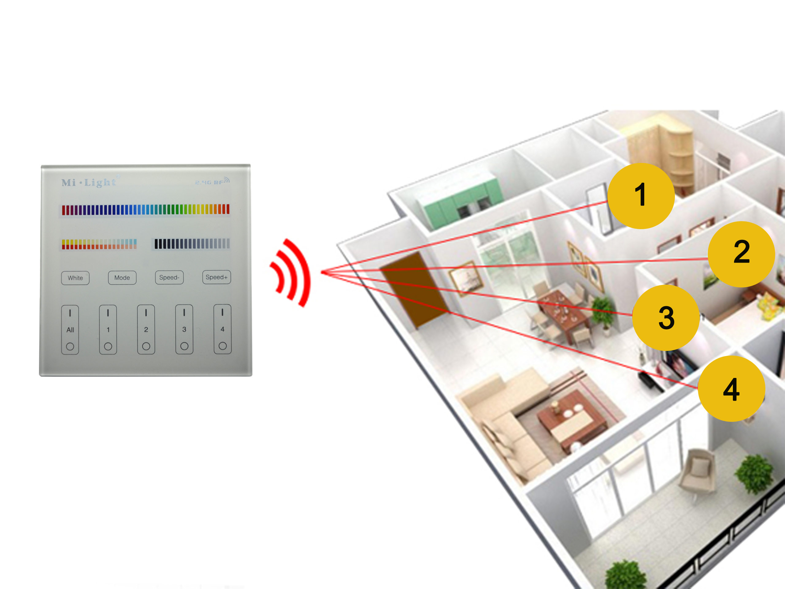 Система керування MiLight RGBWW (RGB+CCT) дозволяє створити до 4 зон освітлення, якими можна керувати одночасно або незалежно. Додатково можна керувати панеллю T4 з живленням 230 В змінного струму, пультом дистанційного керування MiLight RGBWW FUT092 або смартфоном / планшетом з операційною системою Android або iOS - після використання роутера MiLight iBox 1 або iBox 2.