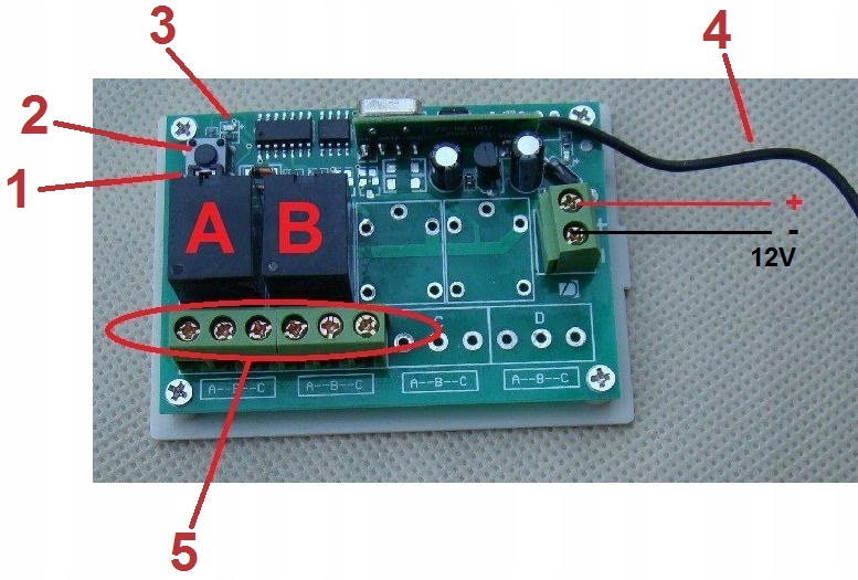 Приймач має розмір 7,5x5,5 см і товщину 2,5 см. Живлення через 12VDC (+ -1V) згідно зі схемою. Кожен канал має реле з 3 контактами: загальний COM (позначений B), NO (A) і NC (C).