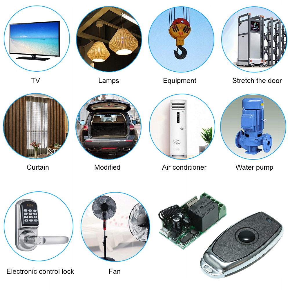 10. Широке застосування, підтримка дистанційного керування до 16 штук. Його можна під’єднати до замка з електронним керуванням, дверного дзвінка внутрішнього зв’язку, дверей гаража, освітлення, електричної завіси, побутової техніки, керування двигуном, системи безпеки тощо. Таким чином, він може дистанційно розблокувати двері, закрити світло, відкрити або закрити штору тощо. Специфікація: