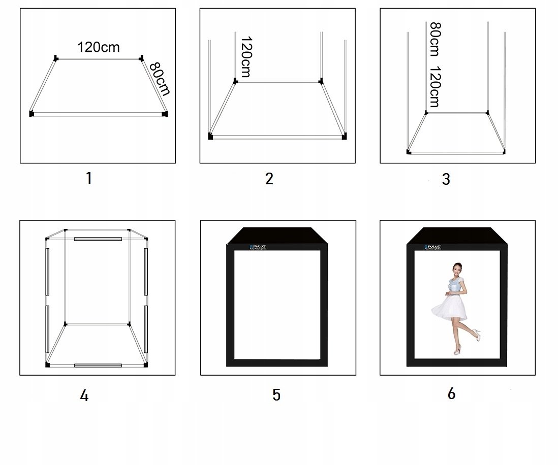 Намет величезного розміру, тому може відповідати різним вимогам до зйомки. Збірка конструкції займає деякий час. Це лише шість кроків, без складного процесу встановлення. Кріплення на раму з міцних каркасних труб. Намет-студія може не тільки забезпечити рівномірне освітлення, але й усунути тіні та відблиски. Що ще важливіше, немає стробоскопічного ефекту. Не втомлює очі при тривалій роботі.