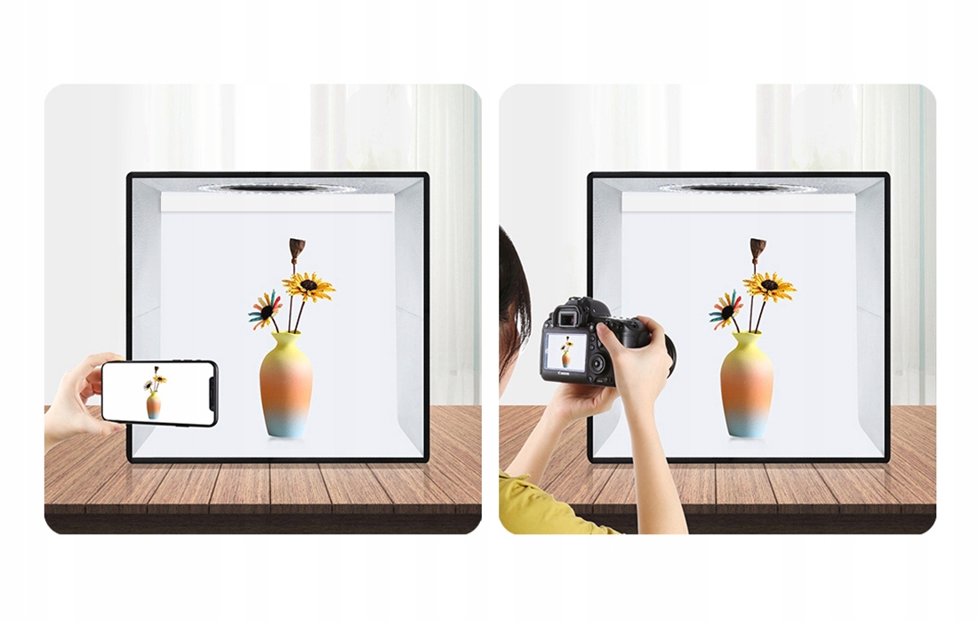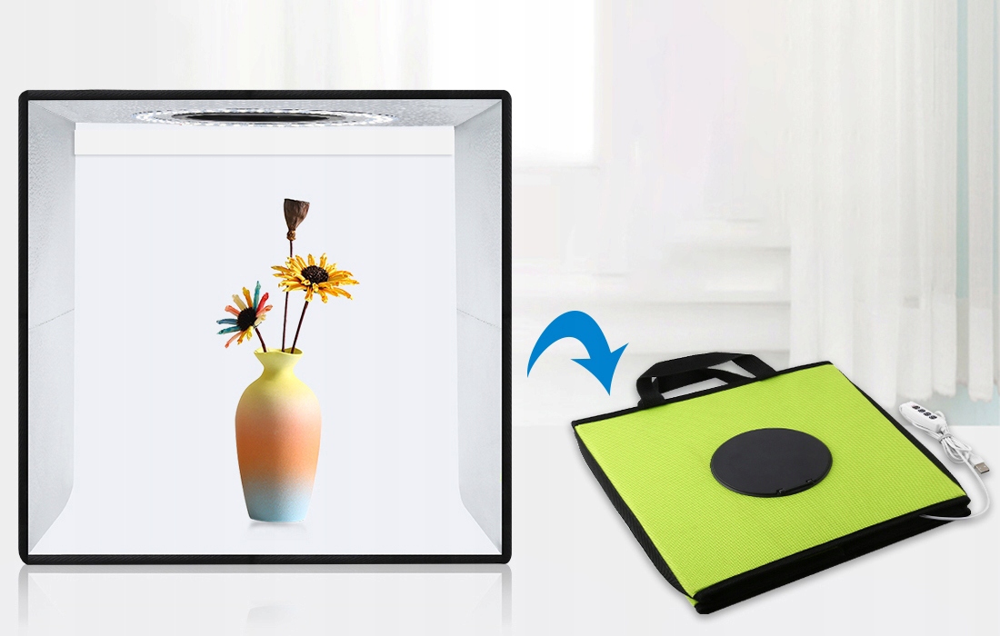 Намет дуже легко розкладається і складається. Завдяки 2-метровому USB-кабелю він дає вам свободу працювати - ви можете підключити його до зарядного пристрою, зарядного пристрою або навіть ноутбука. Продумана конструкція виробу дозволяє робити фотографії з різних ракурсів - також зверху, через спеціальний отвір. Внутрішня частина намету виготовлена зі спеціального матеріалу, який дозволяє рівномірно розподіляти світлодіодне світло, забезпечуючи оптимальне освітлення об’єктів, що фотографуються.