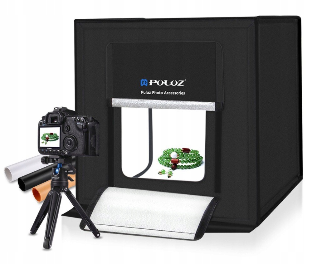 Намети освітлення бренду Puluz використовуються для створювати якісні фотографії предметів без тіні. Весь набір готовий до роботи відразу з коробки, збірка займає всього кілька хвилин. Це зручно, тому ми можемо використовувати його на вулиці, вдома чи в офісі. Продукт виправдає очікування навіть найвимогливіших користувачів. Все, що нам знадобиться для створення знімків – це фотоапарат або телефон. Для повноцінної роботи не потрібно купувати додаткові аксесуари.