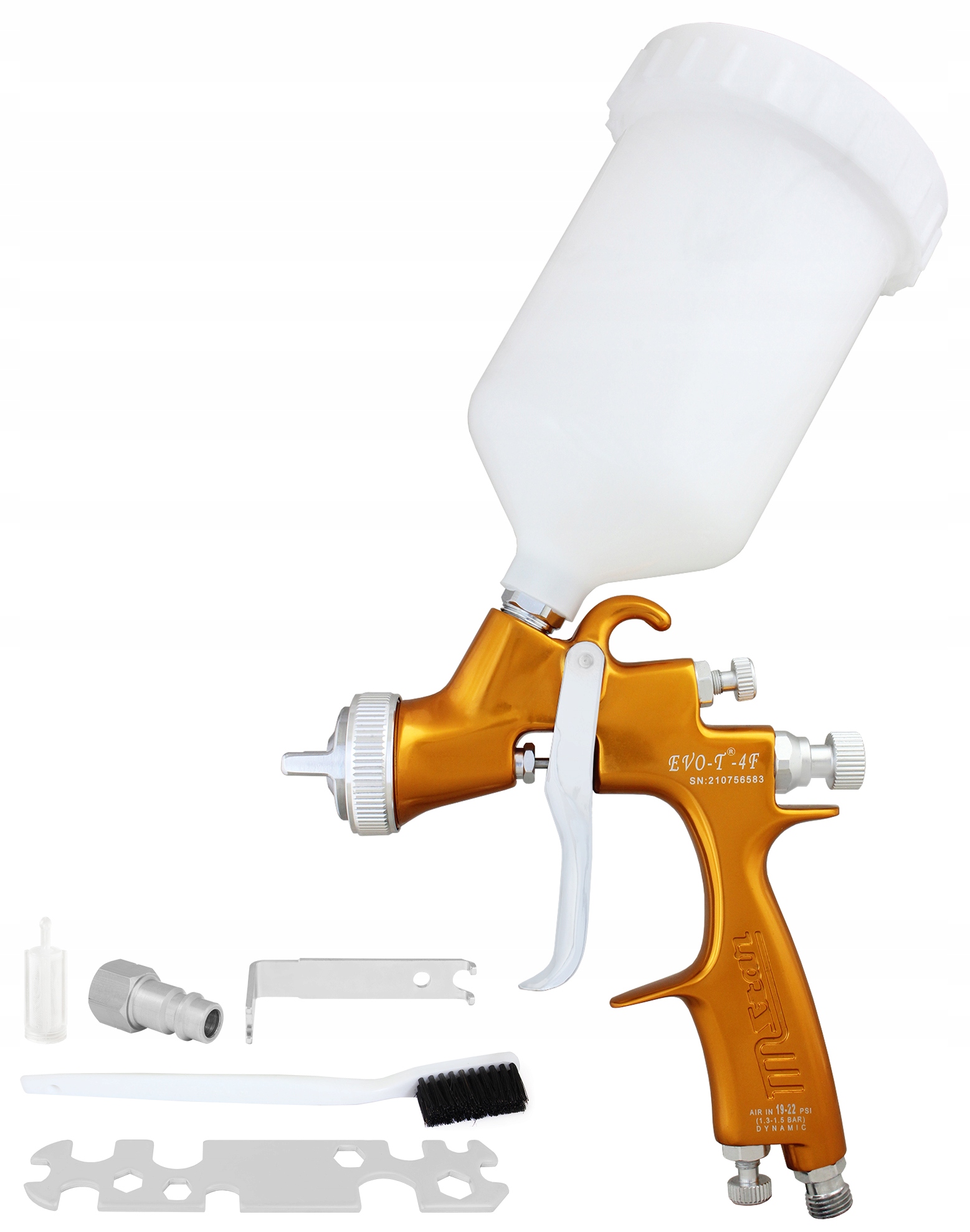 Фарбопістолети STAR є найвищою якістю серед професійних фарбувальних пістолетів, модель EVO-T 4F LVLP поєднує компактні розміри з міцністю та ефективністю системи LVLP - ця технологія забезпечує ефективне перенесення матеріалу понад 72% з дуже низька витрата повітря.