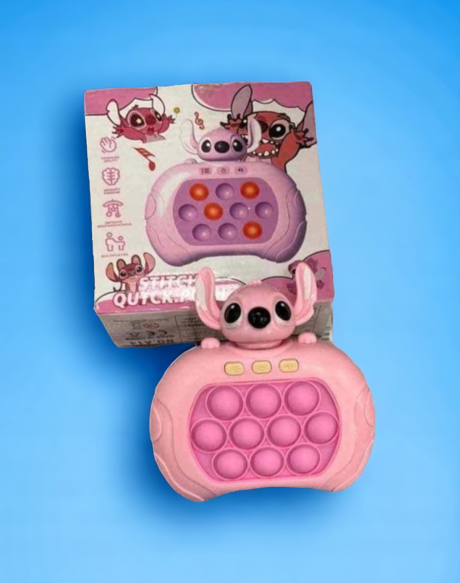 Pop it Stitch — це гра, яка поєднує візуальні й звукові елементи, створюючи захоплюючий досвід. Кольорове світло та мелодійні звуки не тільки привертають увагу, але й стимулюють почуття дитини, підтримуючи її когнітивний розвиток. Можливість регулювати гучність дозволяє адаптувати гру до різних середовищ. Це робить Pop it ідеальною іграшкою як для тихої гри вдома, так і для емоційної грипід час зустрічі з друзями.