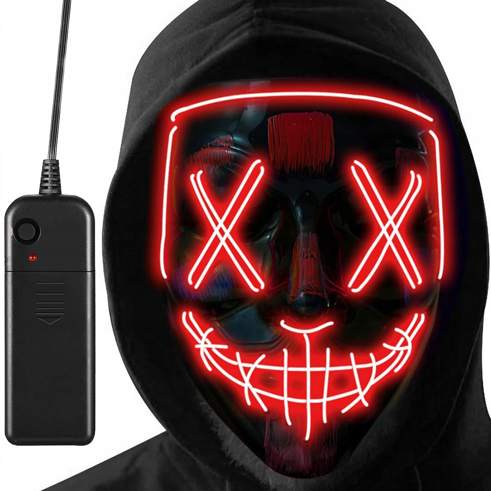 Світлодіодна маска Purge - це аксесуар, який ідеально підійде як частина костюма на Хелловін. Звичай влаштовувати вечірки на Хелловін стає все більш популярним, і вибір унікального костюма є дуже важливою частиною цієї традиції. Вбудоване світлодіодне освітлення неодмінно виділить вас з натовпу - здивуйте друзів або налякайте дітей, що збирають цукерки! Головний убір ідеально підходить для карнавальних балів, тематичних вечірок, виступів, як доповнення до косплей-наряду, а також може бути елементом декору на Хелловін, дозволяючи краще відчути неповторну атмосферу цього свята. Маска має еластичний регульований ремінець і м'яку губку в області чола, завдяки чому вона адаптується до будь-якого обличчя. Управління світлом здійснюється за допомогою пульта дистанційного керування, що живиться від двох батарейок АА (не входять в комплект). Пульт дистанційного керування підключається за допомогою метрового кабелю та має спеціальну кліпсу, яка дозволяє кріпити його на брючному ремені.