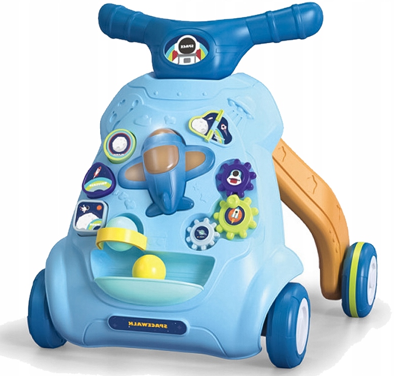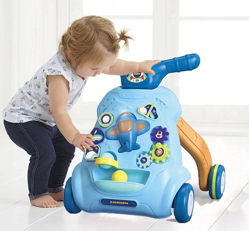Завдяки штовханню ви зможете ідеально поєднати приємне з корисним, а ваша дитина точно не буде нудьгувати завдяки безлічі різнокольорових аксесуарів. Стійка спинка ходунків може бути наповнена водою, що допоможе вашій малечі освоїти складну навичку ходьби. Ходунки також є чудовим ігровим центром. Тут ви знайдете як постійні елементи, такі як шестерні та кольорові кнопки, так і ті, які можна зняти та використовувати для самостійної гри (літак і м’ячі).