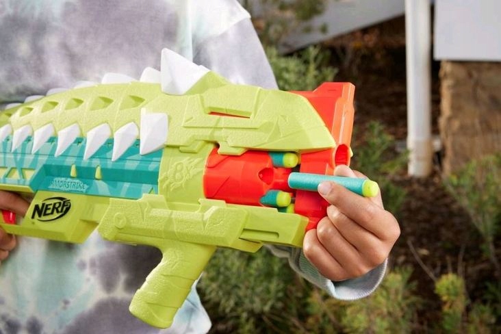 Розпочати дію з бластером DinoSquad Armorstrike, форму та кольори якого натхненний виглядом динозавра Ankylosaurus. Зовнішній вигляд ящірки та хижі кольори відлякають багатьох супротивників під час бою NERF.