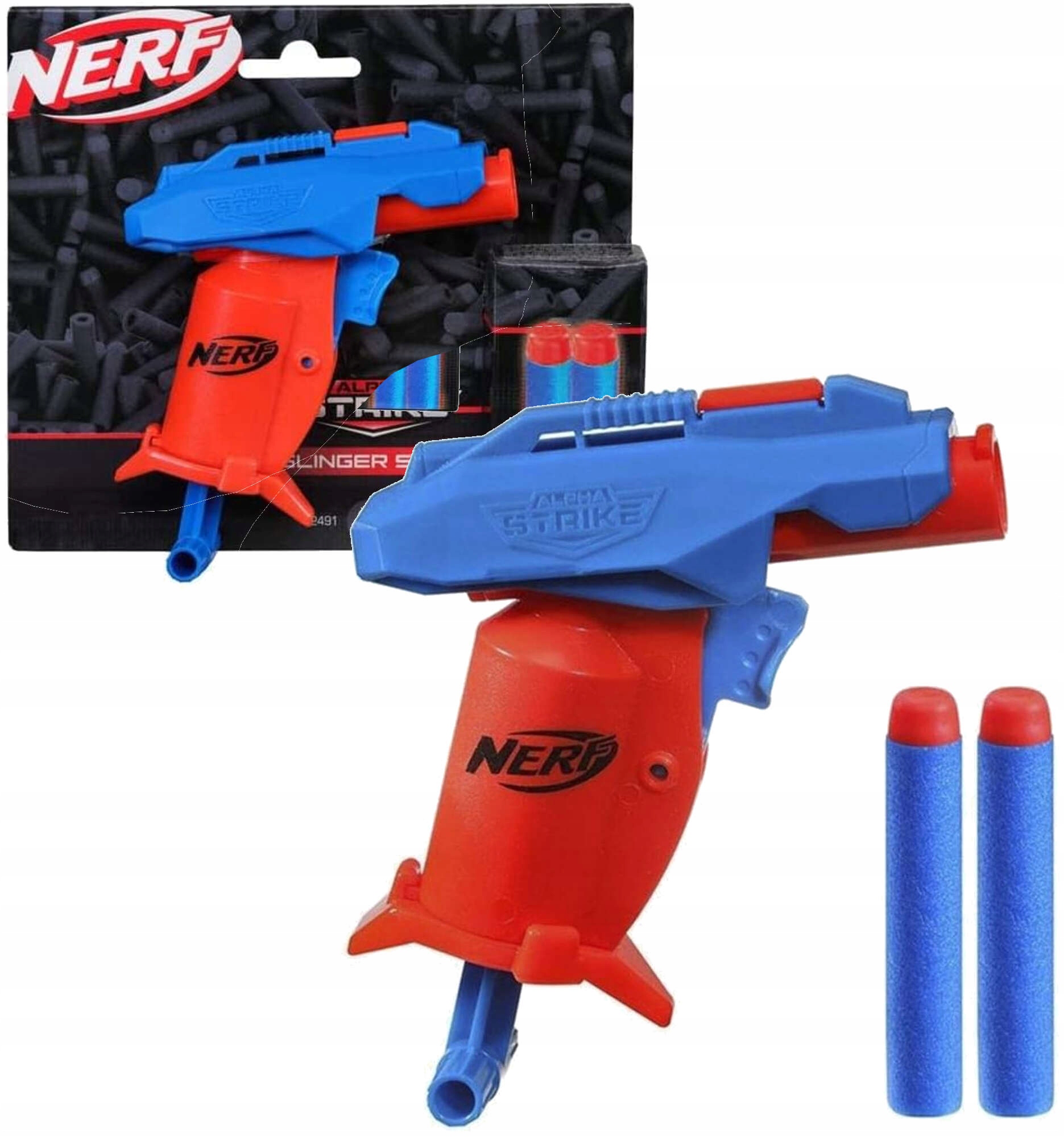 Серія Nerf Alpha Strike Slinger SD-1– це пускова установка для дротиків із місцем для однієї кулі. Зброя зводиться, заряджається через ствол, а спусковий гачок натиснувши, щоб вивільнити пінопласт
