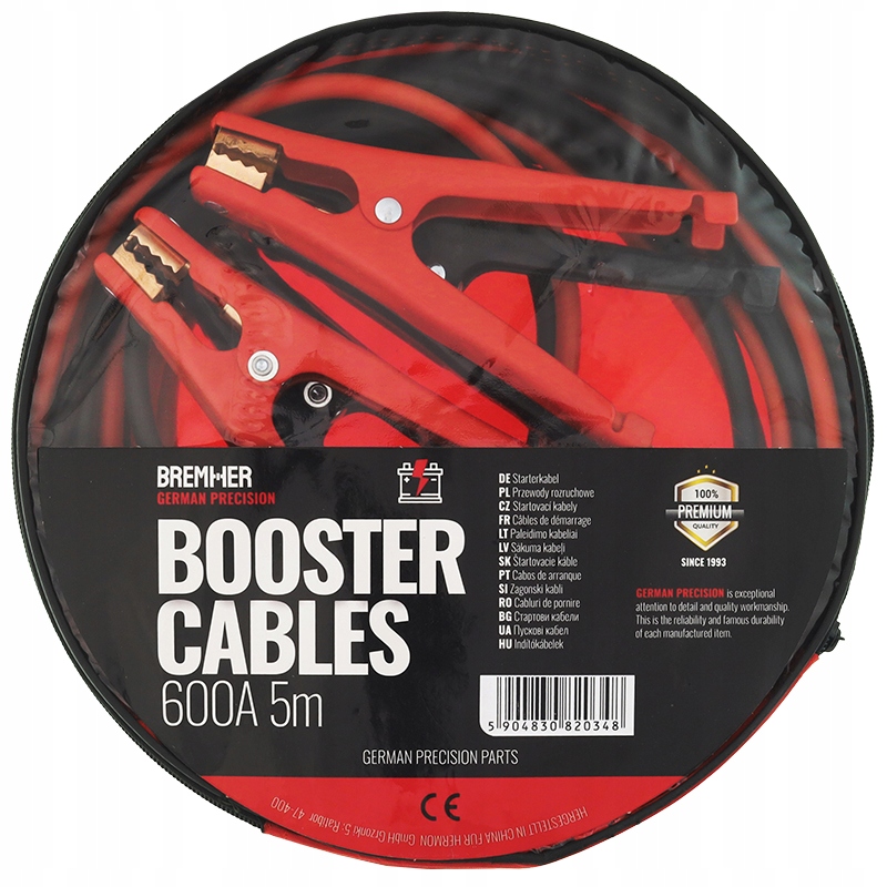 Максимальний струм (А) - 600 Діаметр кабелю (мм) - 9 (оміднений кабель з гумовою ізоляцією) Довжина кабелю з затискачами (м) - 5 Довжина затискачів (мм) - 180 Відстань між ручками (мм) - 85 Кількість кабелів - 180 Діаметр кабелів (мм) - 0,25 Затискач для затискачів у сталевій рамі, з покриттям, мідь (гарантує максимальний струм) провідність), упакований у практичний футляр, який полегшує пакування та захищає від бруду.