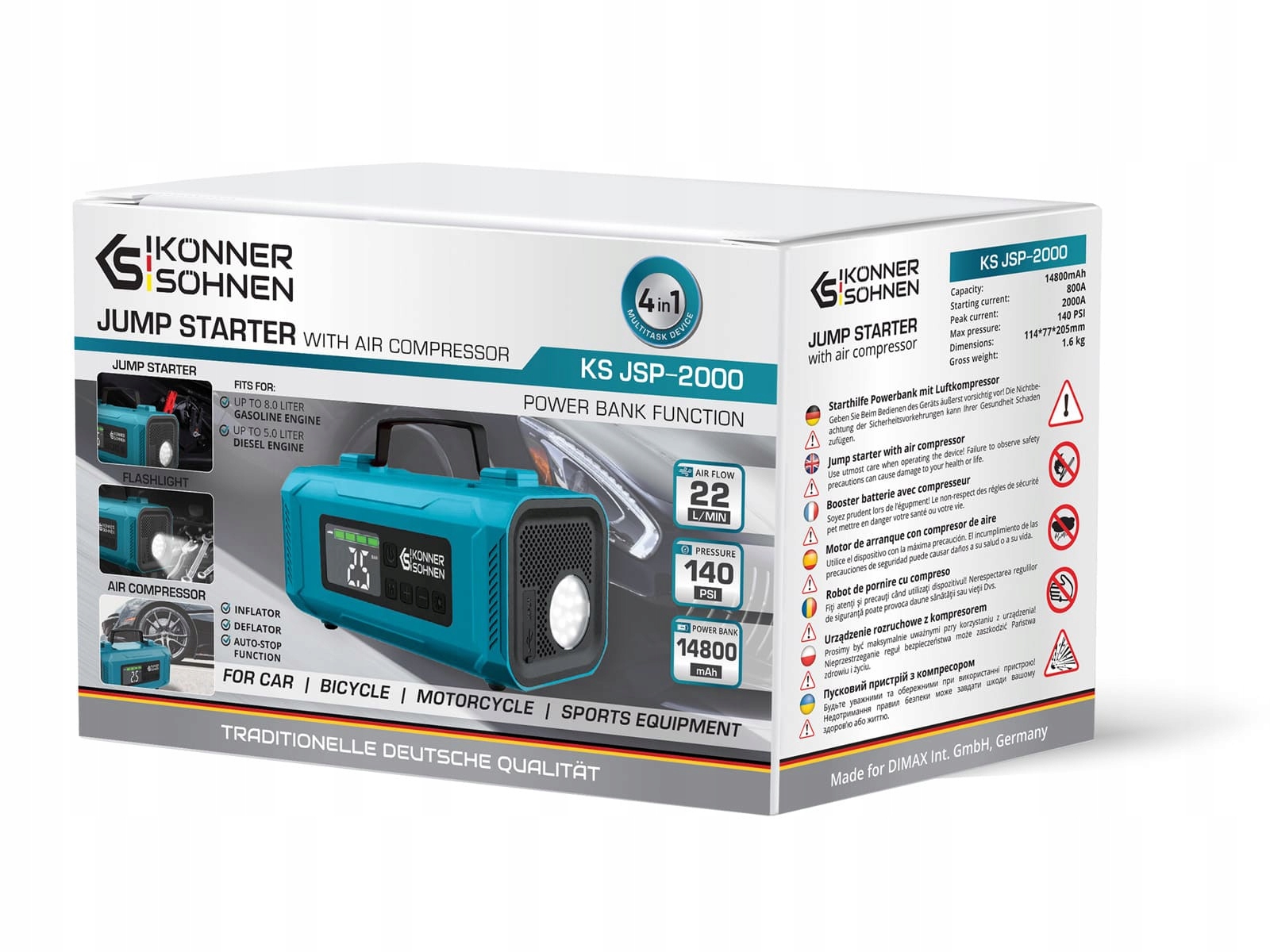 Німецький бренд Könner & Söhnen представляє пусковий пристрій із компресором 4 в 1 KS JSP-2000 - необхідний багатофункціональний пристрій для вашого автомобіля. Він поєднує в собі функції пускового пристрою і зарядного пристрою для бензинових або дизельних автомобільних акумуляторів, компресора для широкого спектру завдань, а також може виконувати функції павербанка і ліхтарика. Обладнання німецького бренду Könner & Söhnen вже успішно продається в понад 20 країнах Європи, пройшло багаторічну перевірку вимогливими європейськими споживачами та отримало багато позитивних відгуків.