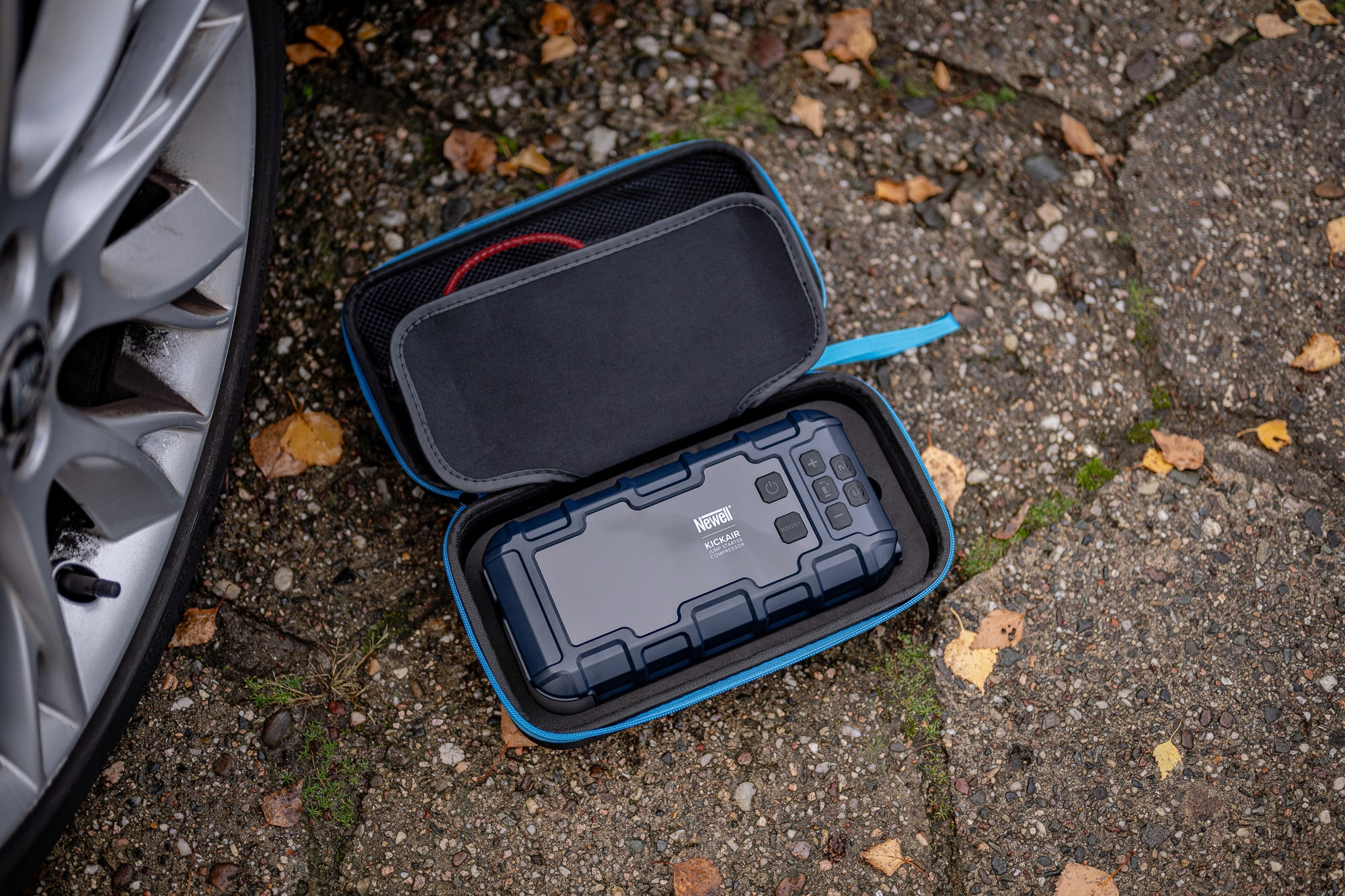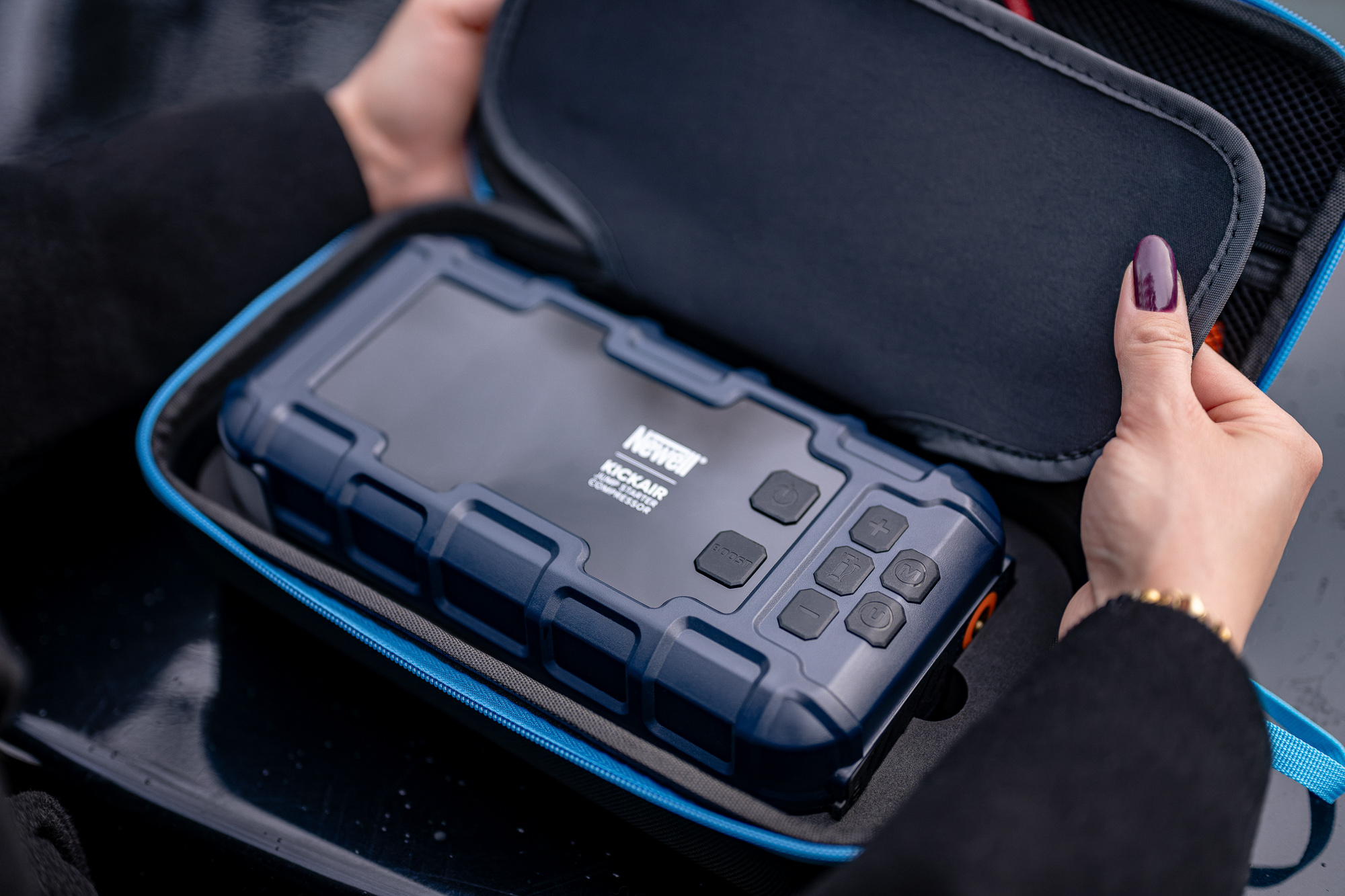 Негативні температури, невеликі відстані автомобіля або світло, яке горіло всю ніч - причин розрядженого акумулятора може бути багато, але одне можна сказати точно - без електрики автомобіль не заведеться. Саме в таких ситуаціях варто мати під рукою Newell KickAir. Це пусковий пристрій, що дозволяє швидко завести виведений з ладу автомобіль. Піковий струм 2000 А легко справляється з бензиновими двигунами до 8 л і дизелями до 6 л. Просто підключіть затискачі, натисніть кнопку «BOOST» і поверніть ключ. Уся операція займає мить, і вам не потрібно зупиняти інших водіїв або дзвонити друзям!