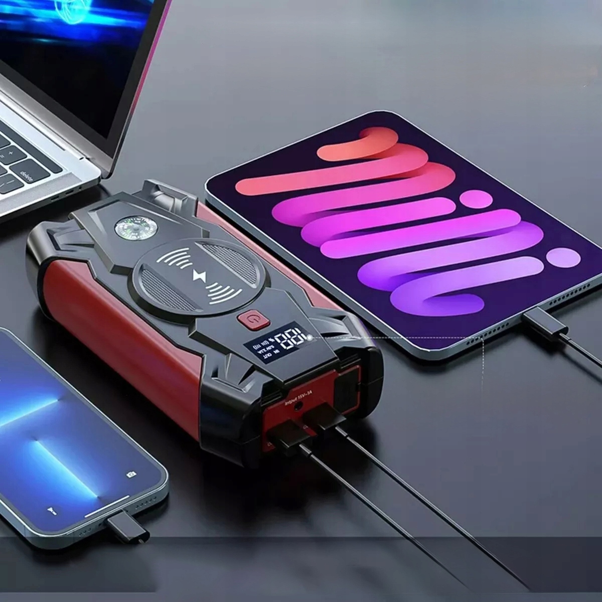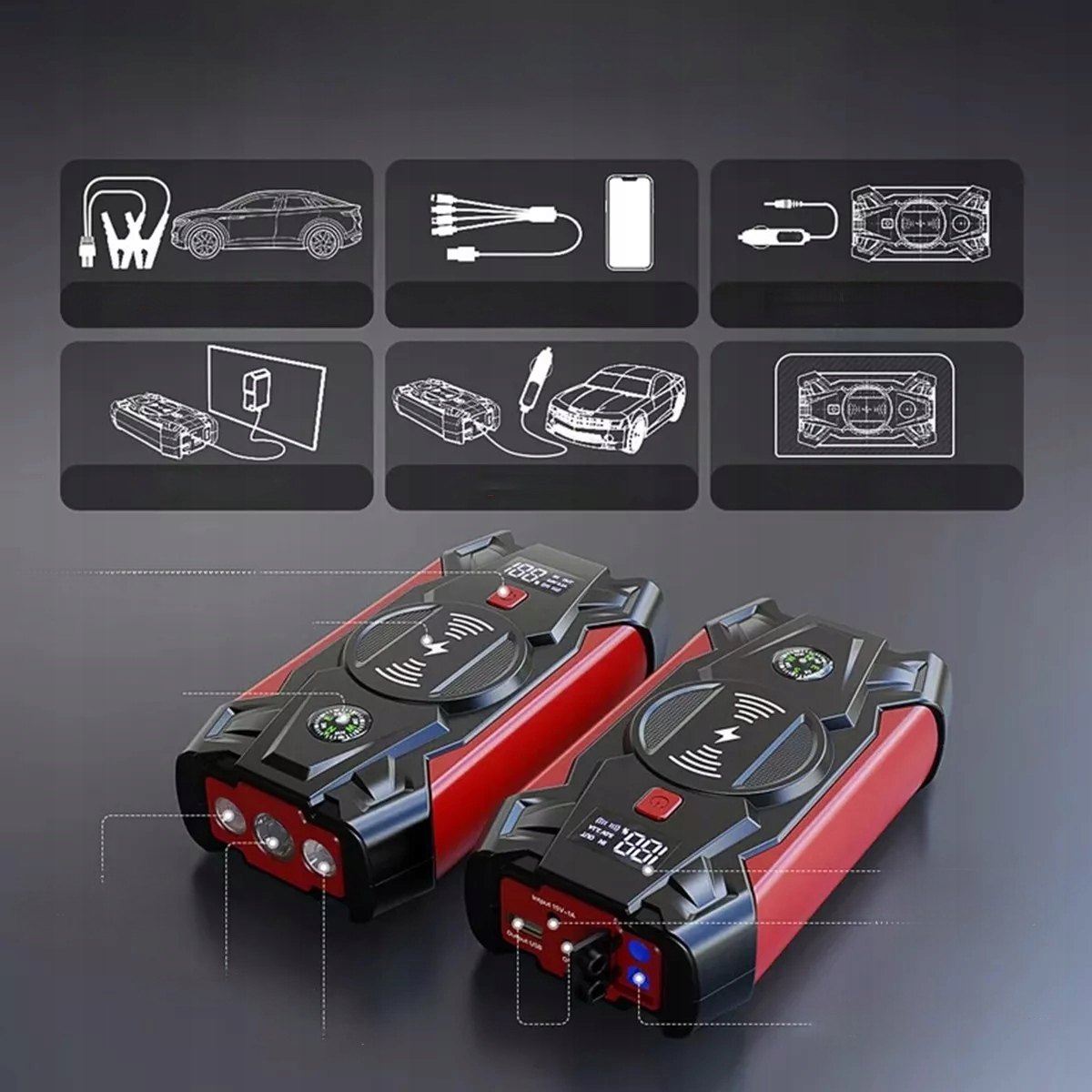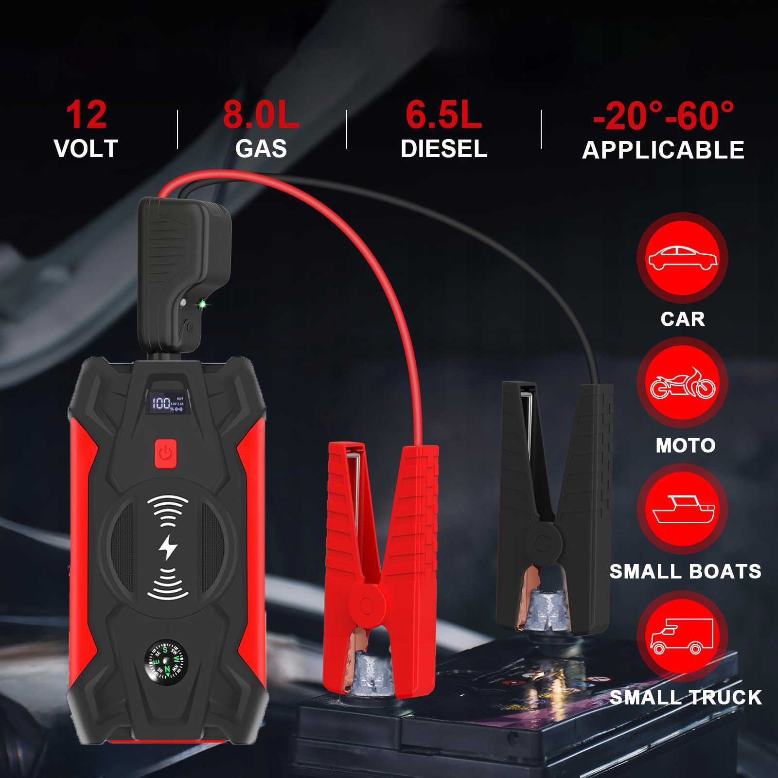 - Jump Starter має функцію бездротового заряджання, яка може звільнити ваші електронні пристрої від пут USB-кабелю (розумні пристрої мають підтримувати бездротове заряджання)