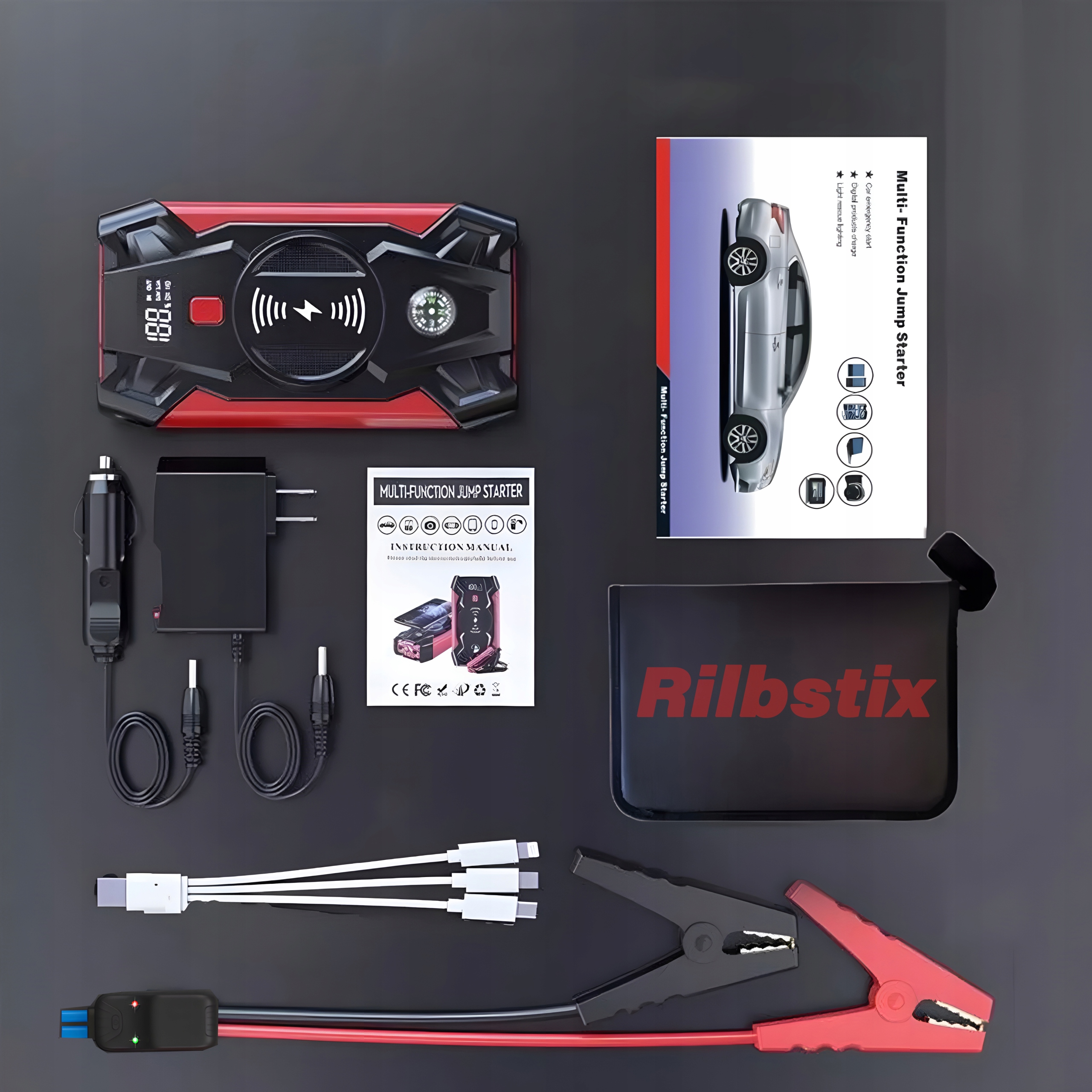 Набір із пусковим пристроєм містить майжевсі необхідні кабелі та аксесуари. Перемичні кабелі, автомобільні та настінні зарядні пристрої, а також кабель живлення для телефону, ноутбука, планшета, камери, mp3/mp4-плеєра та інших електронних аксесуарів.