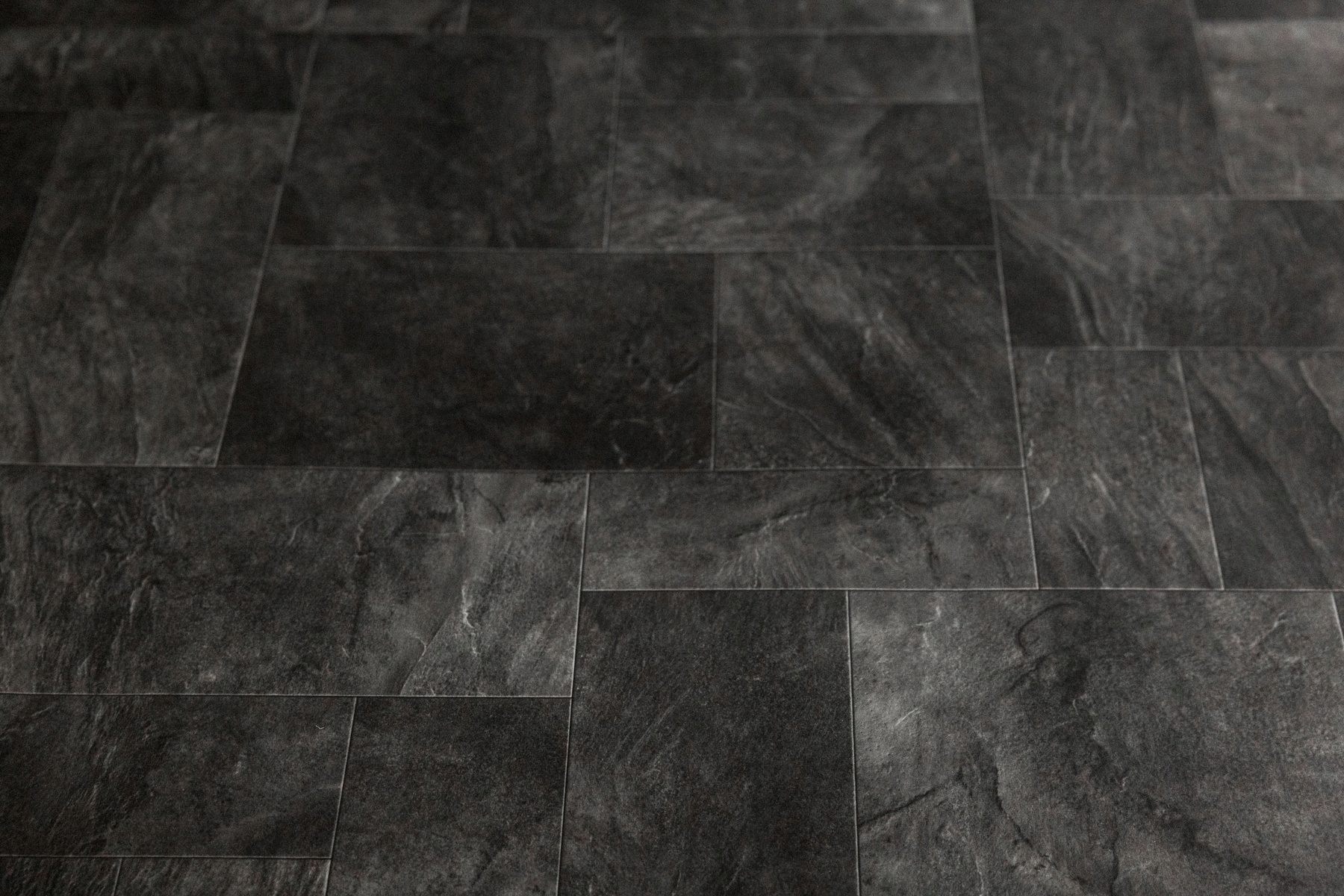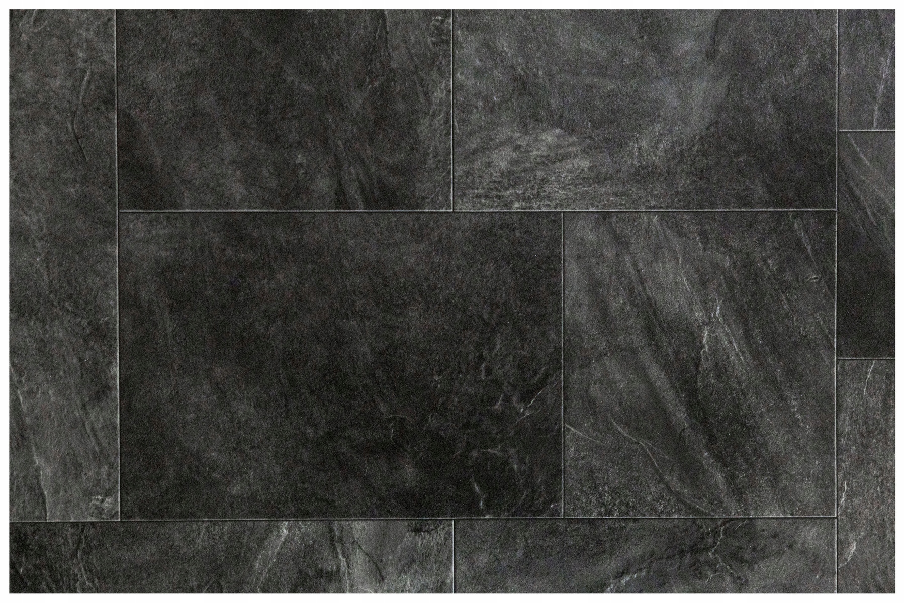 Підлогове покриття Basic Magnus PVC — це імітація підлоги, вкритої прямокутними мармуровими плитками різних розмірів у нерегулярному розташуванні у відтінках темного антрациту, що контрастує з кремовим.
