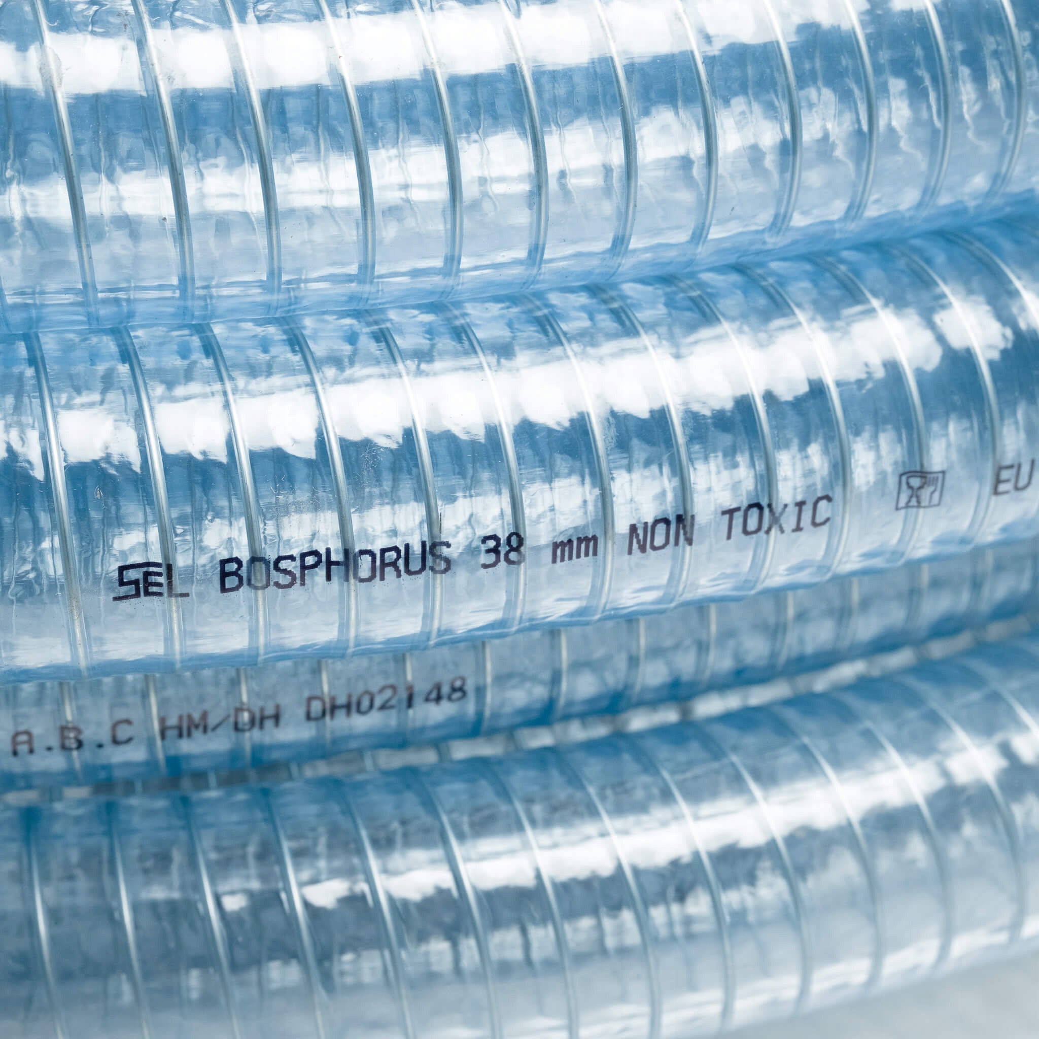 Дуже міцний і гнучкий всмоктувальний і напірний шланг із прозорого ПВХ, посилений спіраллю зі сталевого дроту. Гладкі зовнішні та внутрішні поверхні.