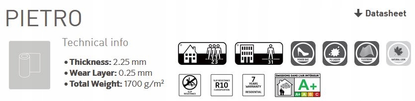 Багата колекція вінілових покриттів для підлоги з дуже хорошими параметрами експлуатації. Призначений для дизайну інтер'єру в житловому будівництві. Гнучка піна, яка використовується як нижній шар килима Pietro, забезпечує хороші ізоляційні властивості та підвищує комфорт використання. ПВХ підлога – простий спосіб швидко змінити дизайн інтер’єру.
