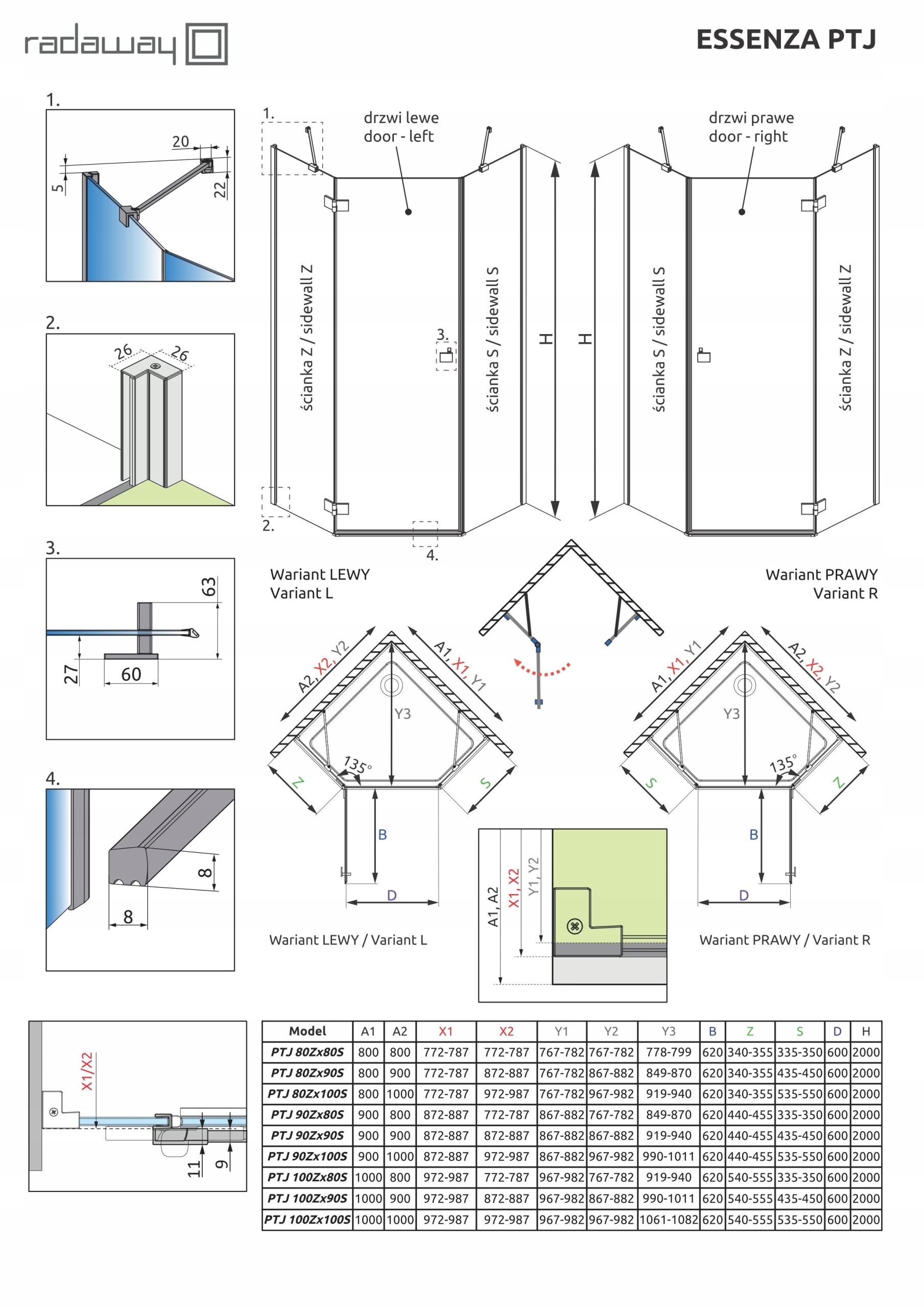 За замовчуванням кабіни розраховані на установку на душовий піддон певних розмірів, і ці розміри вказані в назві кабіни або її частини. Реальні габаритні розміри кабіни трохи менше номінальних розмірів, вказаних у назві артикула. Якщо ви плануєте монтувати кабіну безпосередньо на підлозі, зверніть увагу на габаритні розміри (X1, X2) і розміри до осі скла (Y1, Y2), які вказані на технічному кресленні.