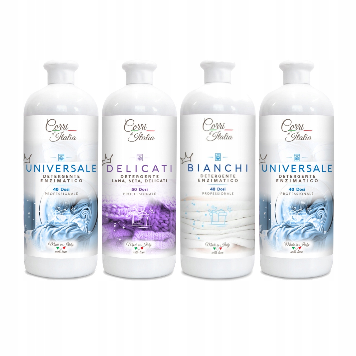 Засоби для прання CORRI D'ITALIA мають концентровану формулу. Вони ідеально пом'якшують волокна та зменшують мінеральні відкладення всередині них, полегшуючи прасування та забезпечуючи виняткову м'якість.