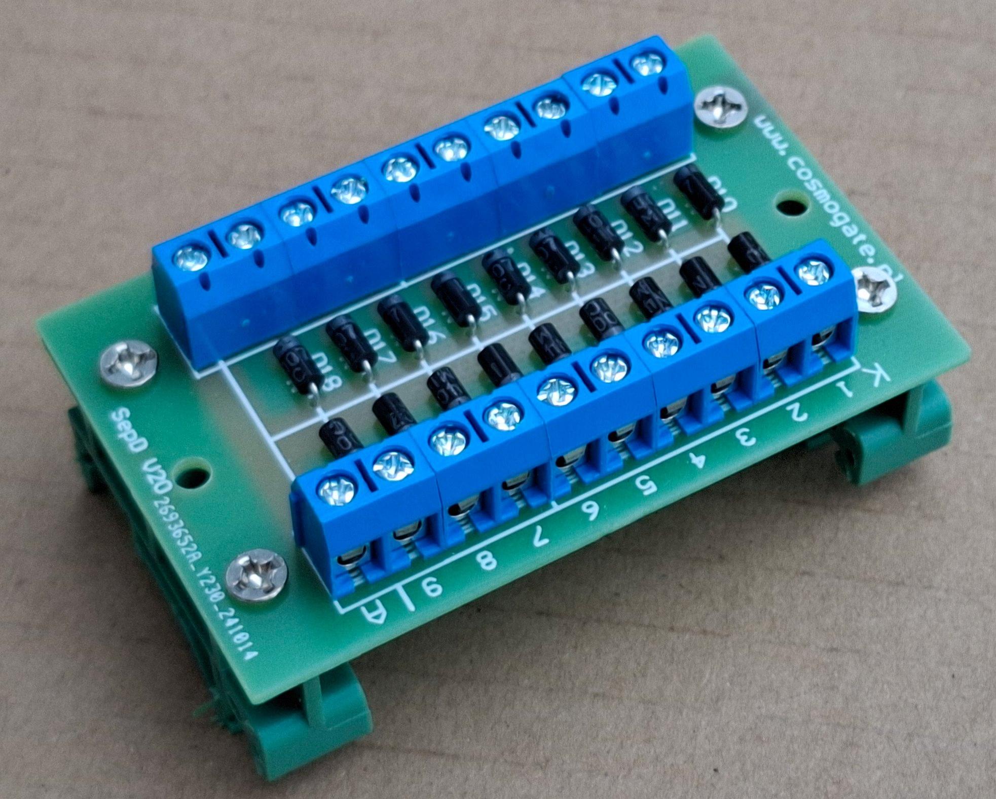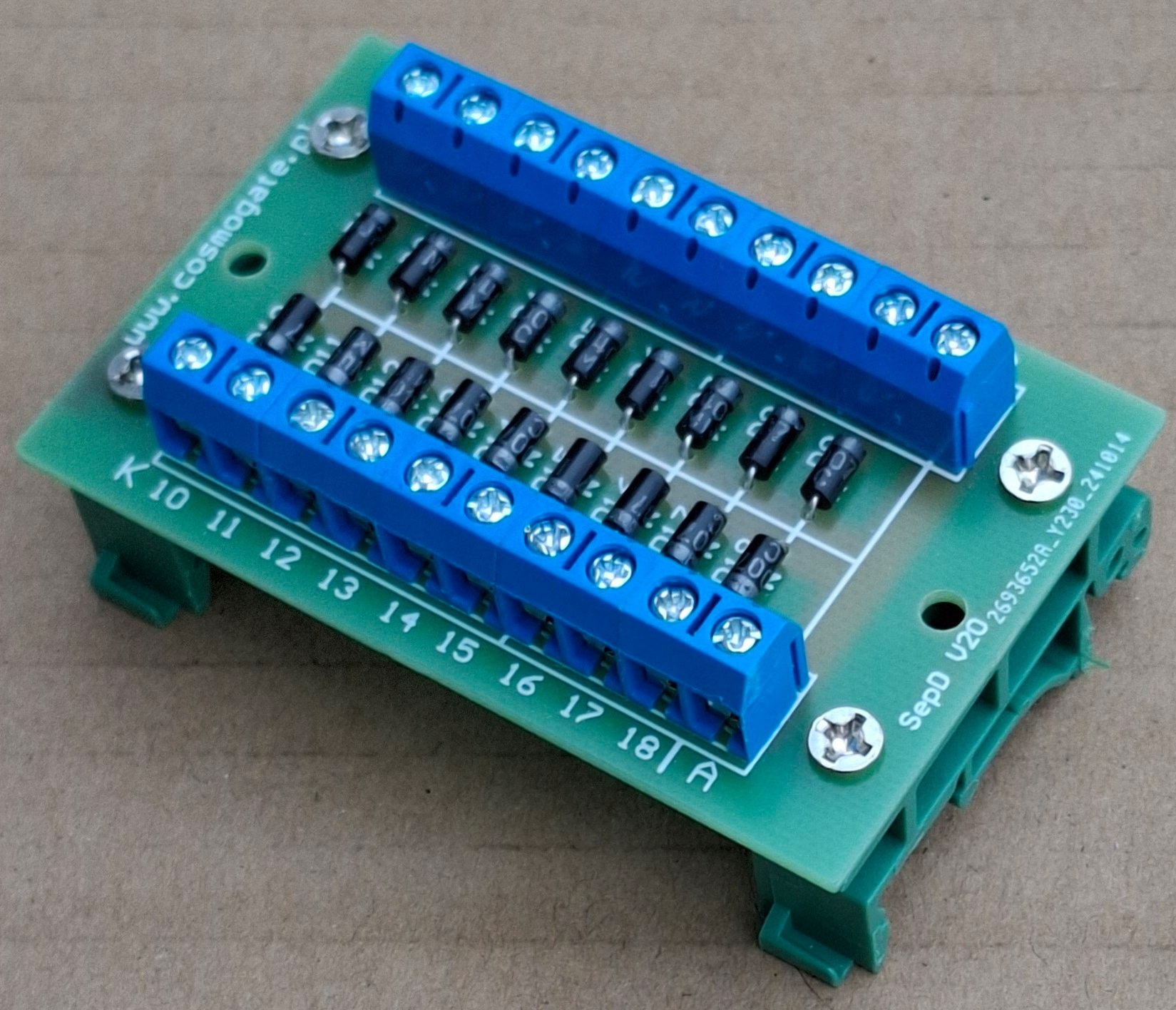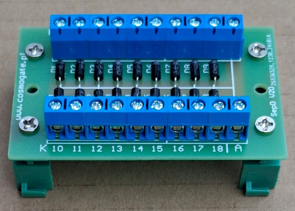 PŁYTKA SEPARATOR DIODOWY 1N4007 x 18sztuk MOCOWANIE NA SZYNE DIN WS. ANODA
