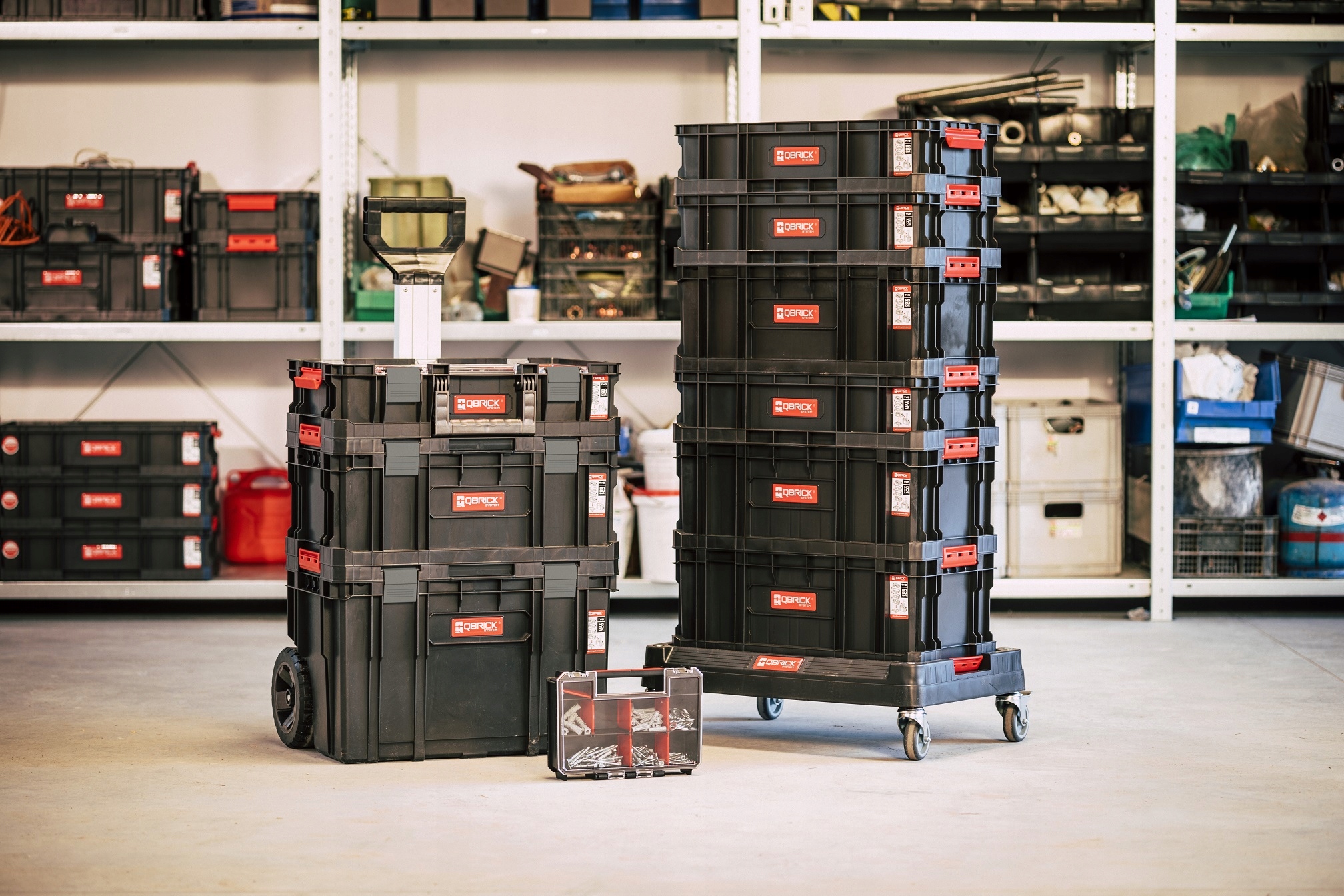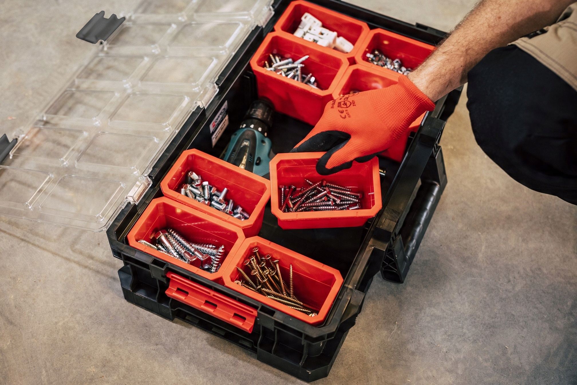 Модульна, міцна коробка для перенесення ручних інструментів, будівельних матеріалів, а також для зберігання різноманітних предметів, напр. у гаражі чи вдома.