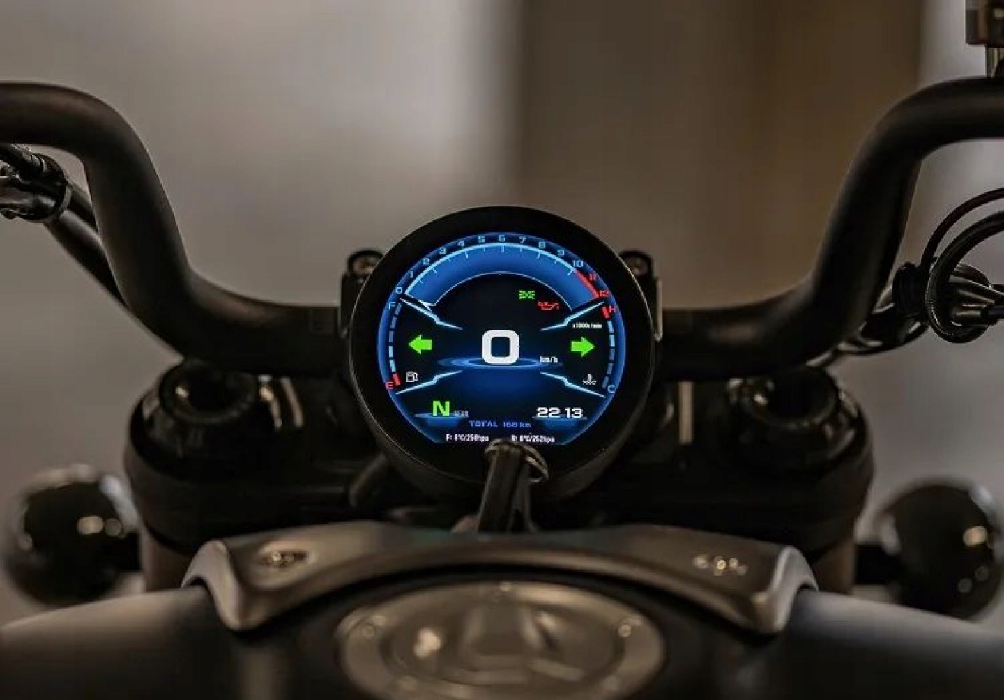 Чітка, добре видима, кольорова кругла TFT-панель SRV 700 показує поточну швидкість, швидкість двигуна , загальний пробіг (ODO), поточна поїздка, рівень палива, температура охолоджуючої рідини, покажчик передач ora