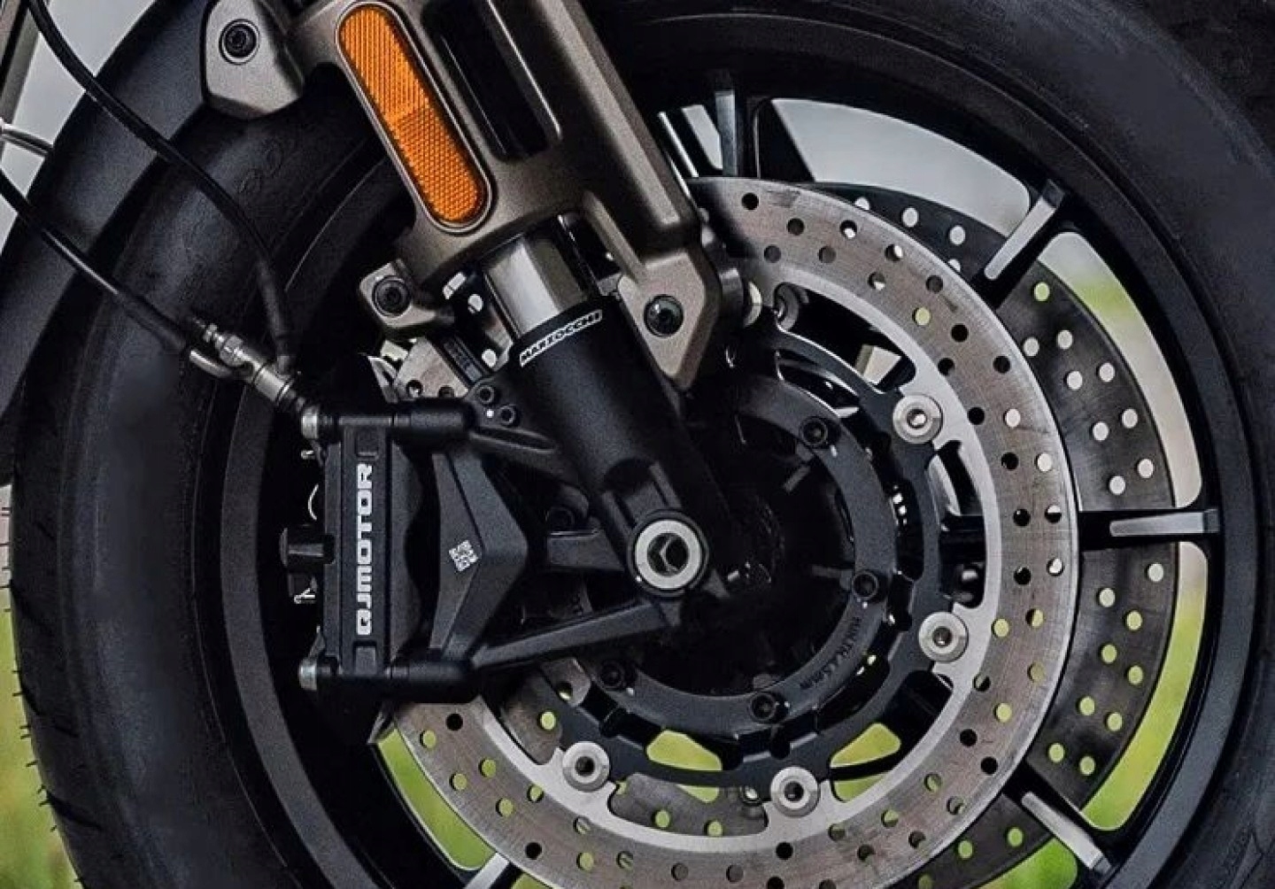 Шасі оснащено високоякісними вилками і заднім центральним амортизатором від відомого бренду MARZOCCHI. Перевернута передня вилка та задній центральний амортизатор точно реагують на нерівності місцевості, забезпечуючи легке та точне керування. Амортизатори Marzocchi забезпечують баланс між комфортом і керованістю в будь-якій ситуації водіння.