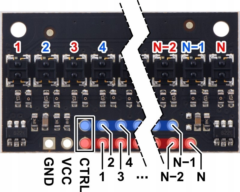 Датчик оббивки, що складається з серії 13 оптронів QTRX із можливістю індивідуального керування яскравістю кожного інфрачервоного світлодіода. Датчики на платі високощільні (HD), відстань між ними становить 4 мм. Модуль може живитися напругою від 2,9 В до 5,5 В і, незалежно від напруги живлення, споживає струм до 31 мА. Оптимальна відстань датчика від землі - 10 мм, а максимальна - 40 мм. Модуль ідеально підходить для виявлення змін у відбитті світла, тому його можна використовувати для виявлення країв землі або відстеження ліній у роботах, що слідують за лініями.