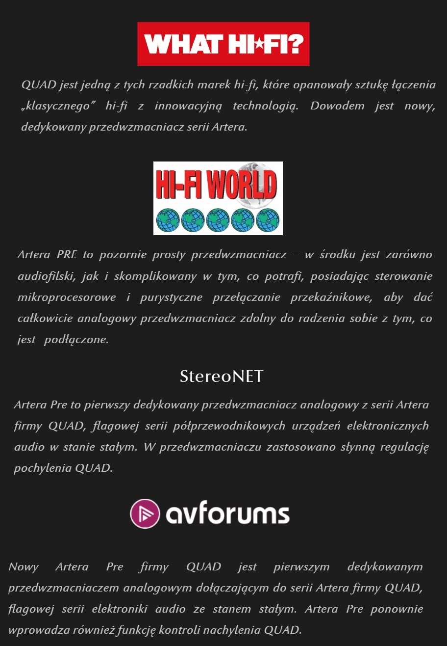 Під час впровадження цих зручностей правил відноситься до класичного квадроцикла 34, Artera pre - це зовсім інший вид звіра, як всередині, так і зовні. Quad 34 відомий своїм "оксамитовим" звуком, відповідно до The Times, коли він був запущений, але трохи відрізняється від незмінної прозорості та нейтралітету, необхідних для найкращих аудіофільних підсилювачів.