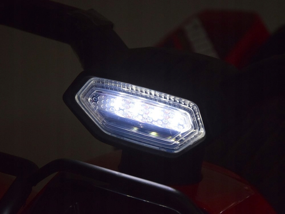 Квадроцикл рухається після натискання червоної кнопки на кермі. Панель містить центр управління звуком, гудком тощо.