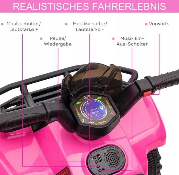 - БЕЗПЕЧНИЙ ТА СТІЙКИЙ: цей дитячий електричний мотоцикл має 4 зносостійкі колеса, які забезпечують плавну їзду по різних поверхнях. Транспортний засіб виготовлено з зручних для дітей поліпропіленових пластику та металу.