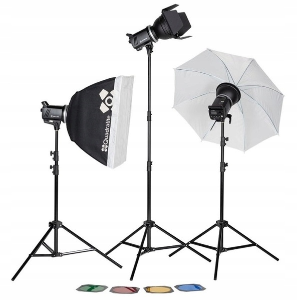 Це найширший набір у нашому Up! серії. X Kit. Містить дві лампи Quadralite Up! X 200 і один Quadralite Up! X 300, три підставки для освітлення, біла прозора парасолька, софтбокс, навіс і ворота з сіткою та кольоровими фільтрами.